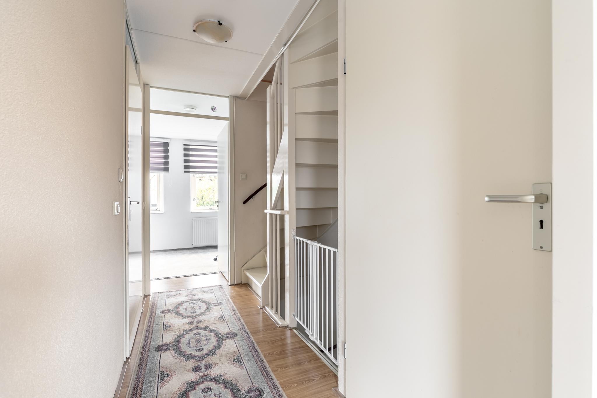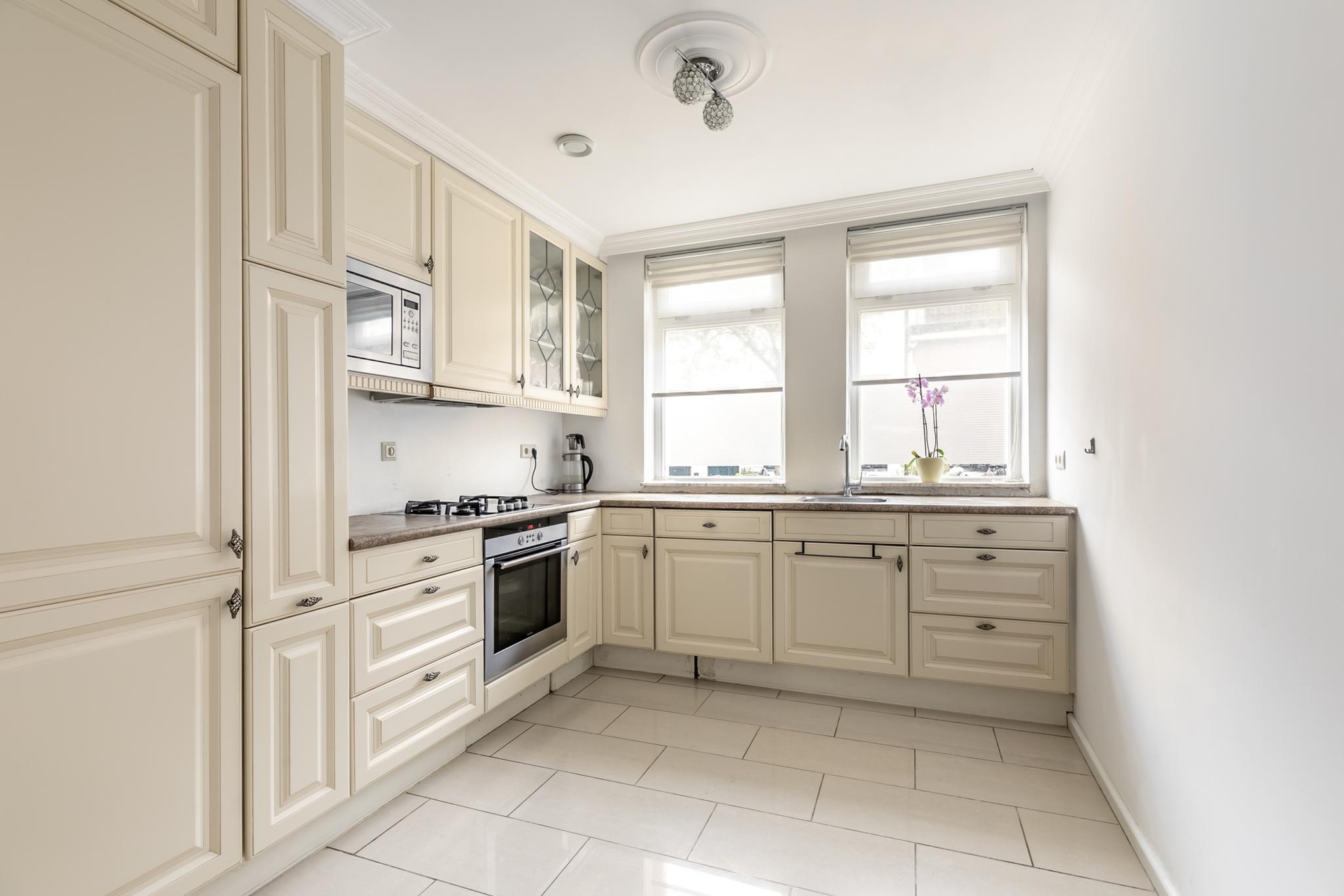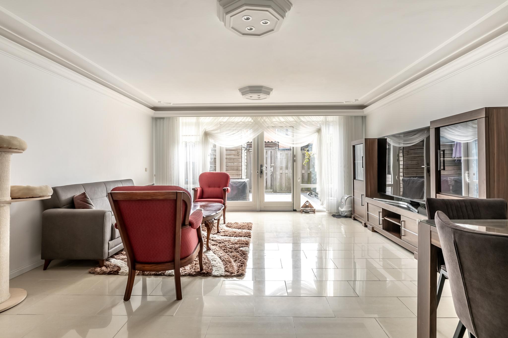 Begane grond: entree, hal met meterkast, toilet met fontein, ruime en lichte woonkamer voorzien plavuizen vloer, gestuukt plafond met lijsten en LED verlichting, openslaande deuren naar de achtertuin met berging en achterom, vanuit de woonkamer is de half open keuken te bereiken voorzien van diverse inbouwapparatuur.