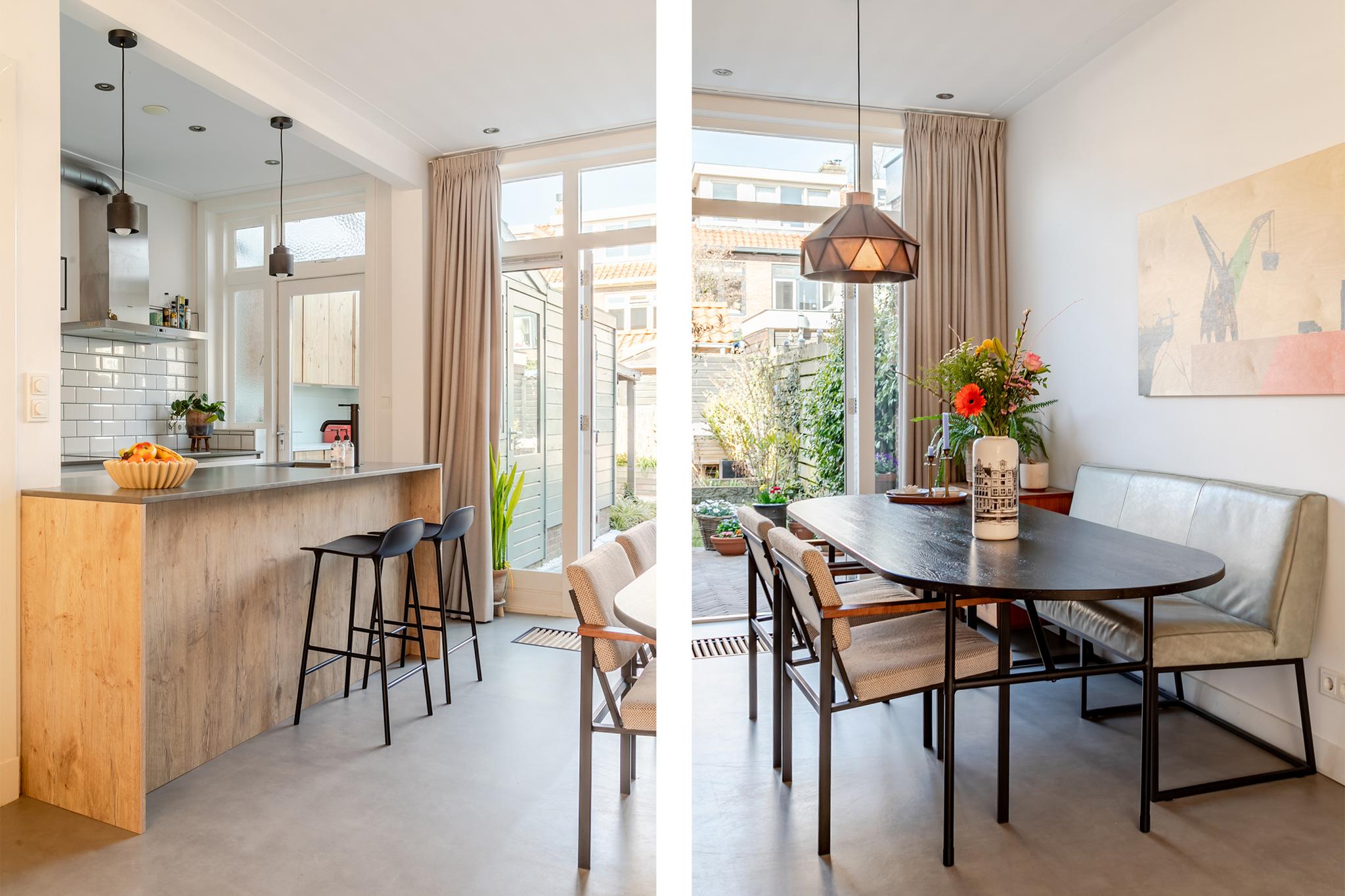 De woonkamer met erker en open keuken (én bijkeuken) geeft toegang naar de zonnige tuin op het westen met achterom. Op de eerste verdieping bevinden zich 3 slaapkamers en een moderne badkamer, en de zolderverdieping is omgetoverd tot een luxe slaapverdieping met een vrijstaand bad en wastafel.