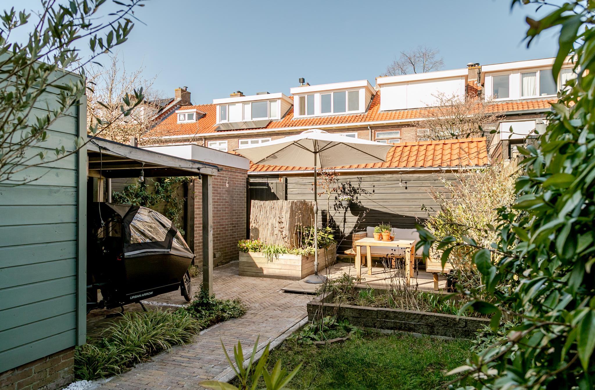 • Heerlijke ruime tuin met achterom, schuur en overkapping voor de fietsen