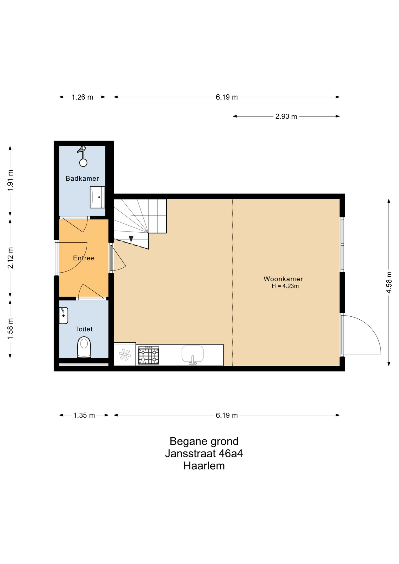 Aan de Jansstraat 46 is de gemeenschappelijke voordeur met brieven en bellentableau te vinden. De gemeenschappelijke hal leidt u naar de fietsenstalling en voordeur van het appartement. De voordeur van het appartement leidt naar een hal waar de badkamer met inloopdouche en wastafelmeubel is, en de aparte toilet met fontein. Voorbij de hal betreedt u de open keuken, die is voorzien van moderne inbouwapparatuur en een was-/droogmachine en woonkamer en een openslaande deur naar de binnentuin. De woonkamer heeft een trap die u naar de entresol leidt. De hoogte van het plafond is hier ~1,75m.