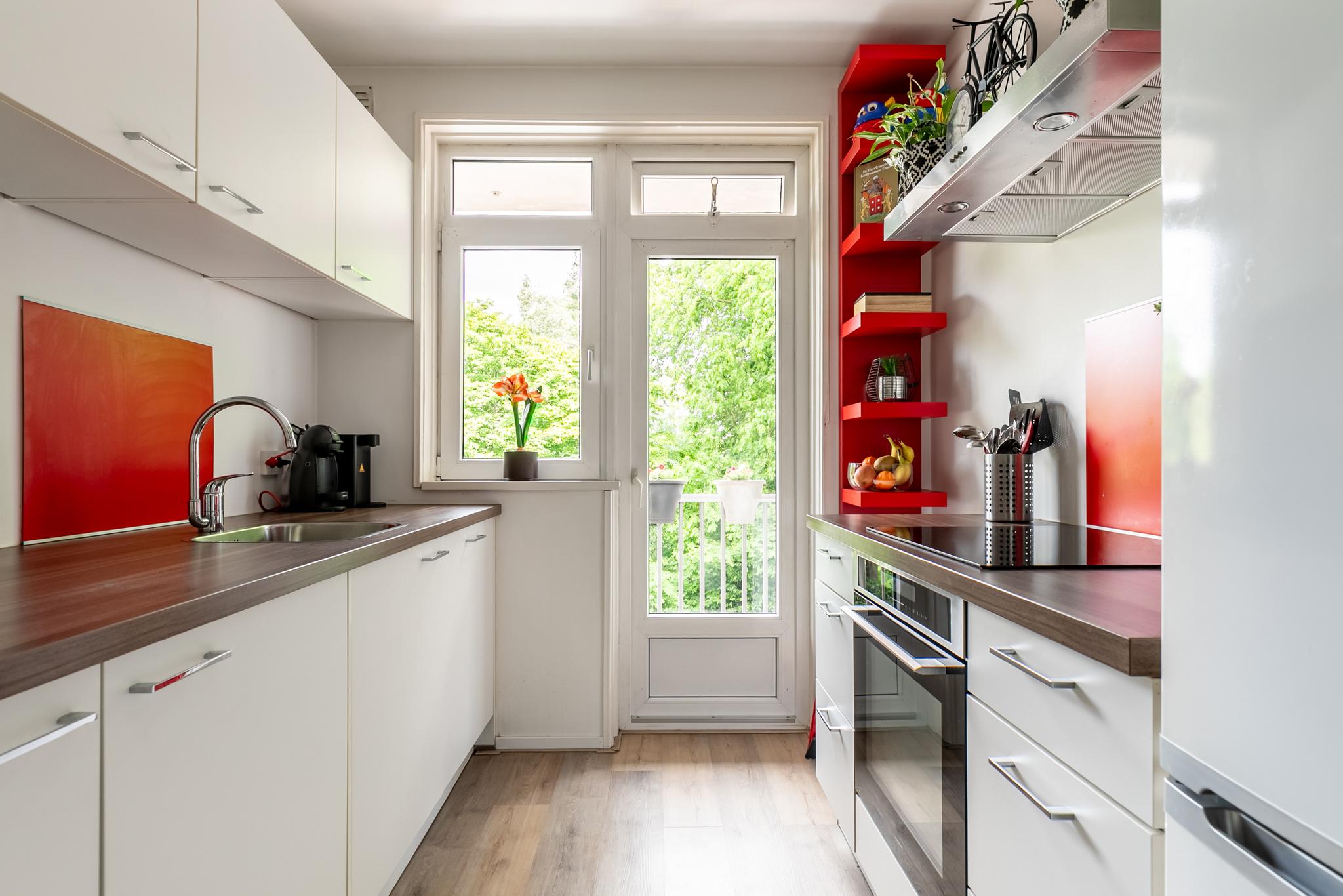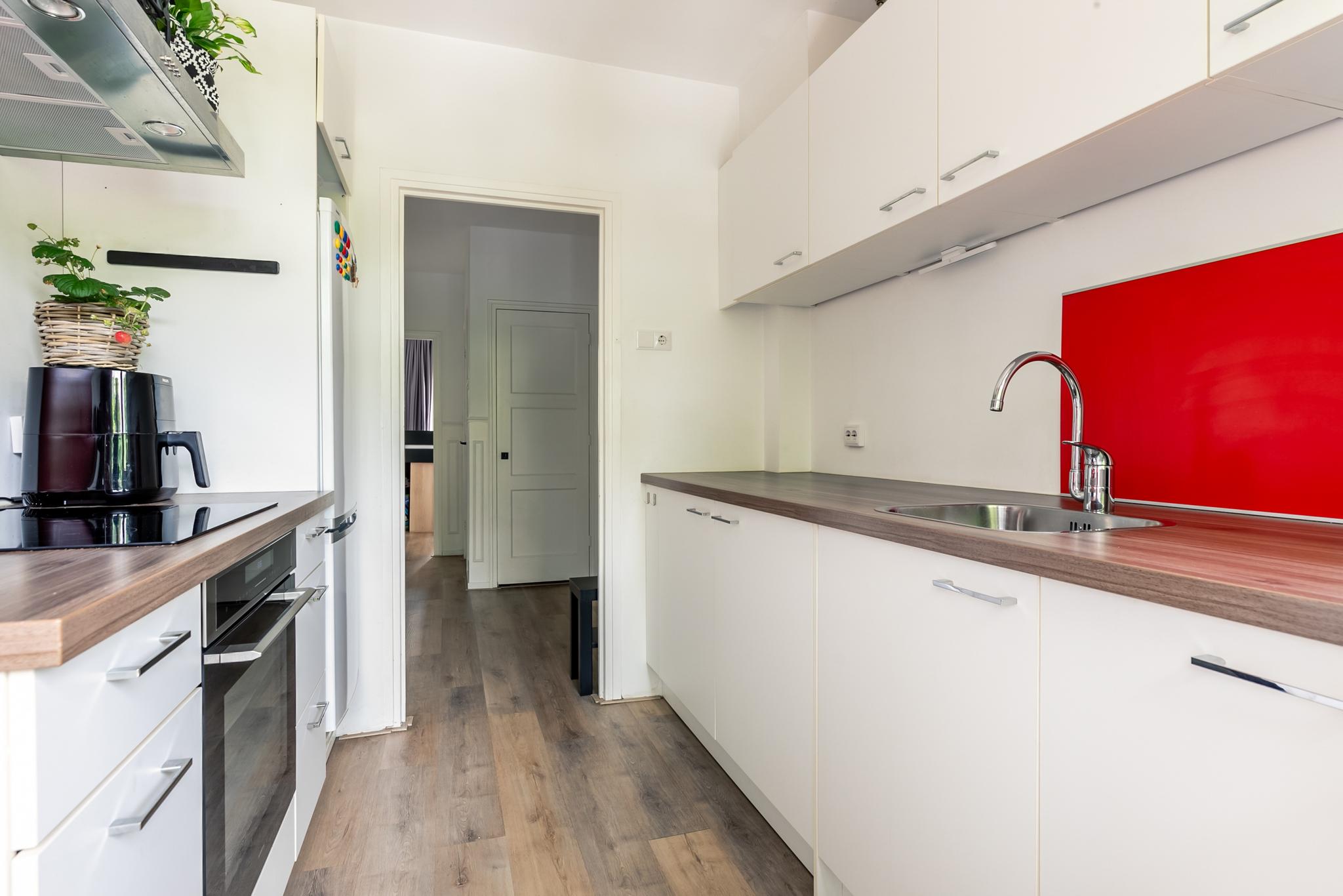 De moderne keuken is voorzien van diverse inbouwapparatuur, waaronder een kookplaat, oven, afzuigkap, koelkast en vaatwasser. Vanuit de keuken heb je toegang tot het tweede balkon aan de voorzijde, gelegen op het noordoosten perfect voor je kop koffie in de ochtendzon.