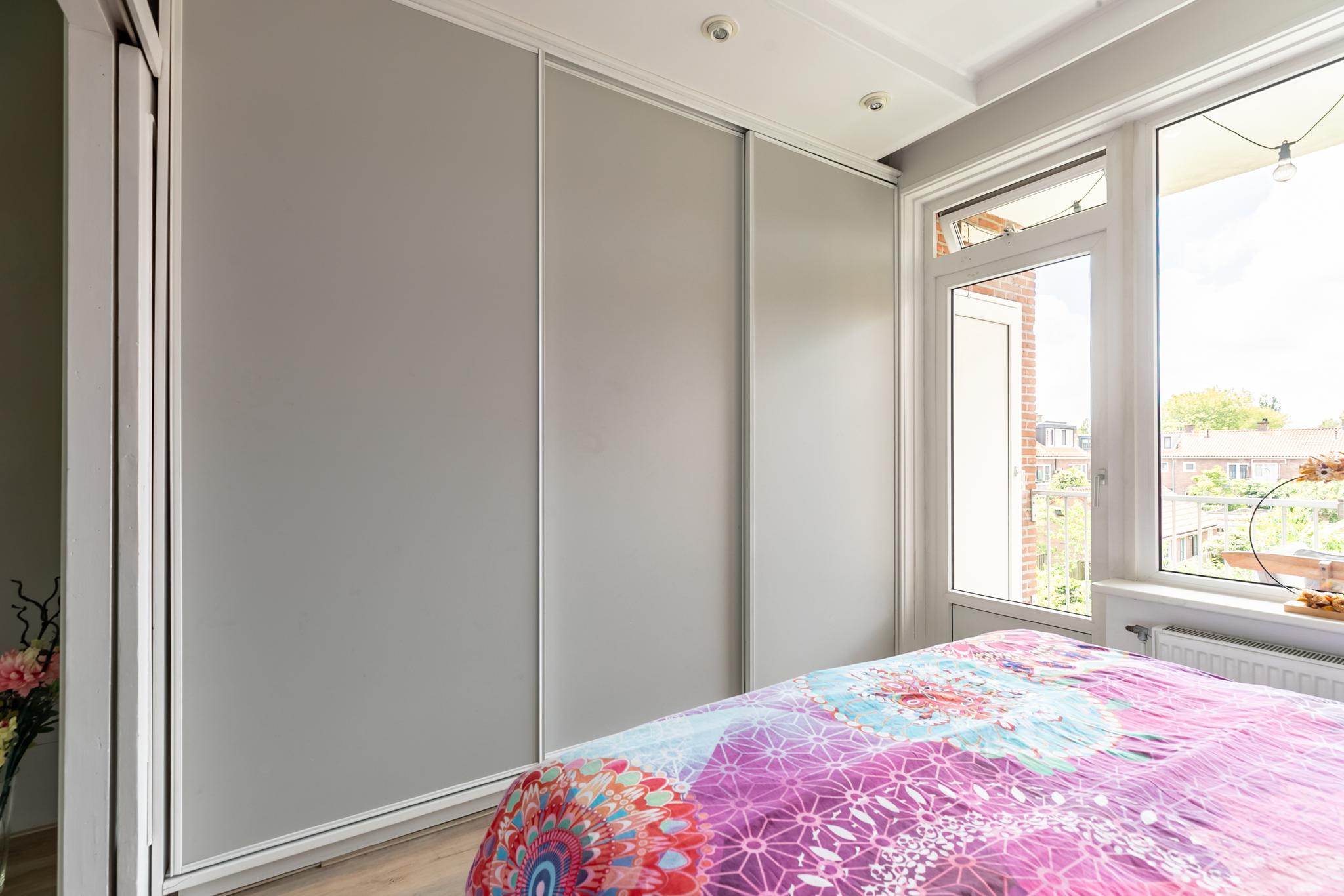 Aan de achterzijde bevindt zich de eerste slaapkamer. Deze kamer is voorzien van een praktische vaste kastenwand en biedt toegang tot het zonnige balkon op het zuidwesten, waar je ’s middags en ’s avonds heerlijk van de zon kunt genieten. Op het balkon vind je bovendien een handige bergkast met de cv-opstelling.