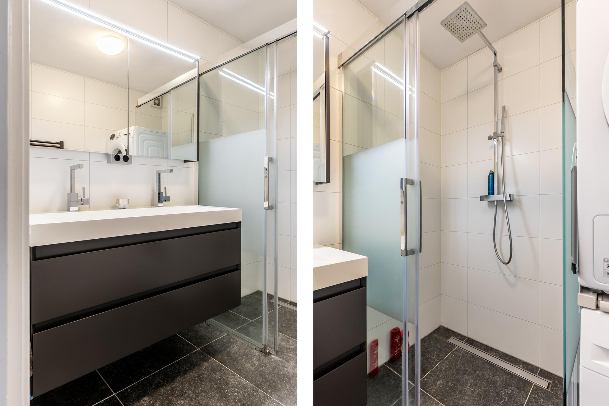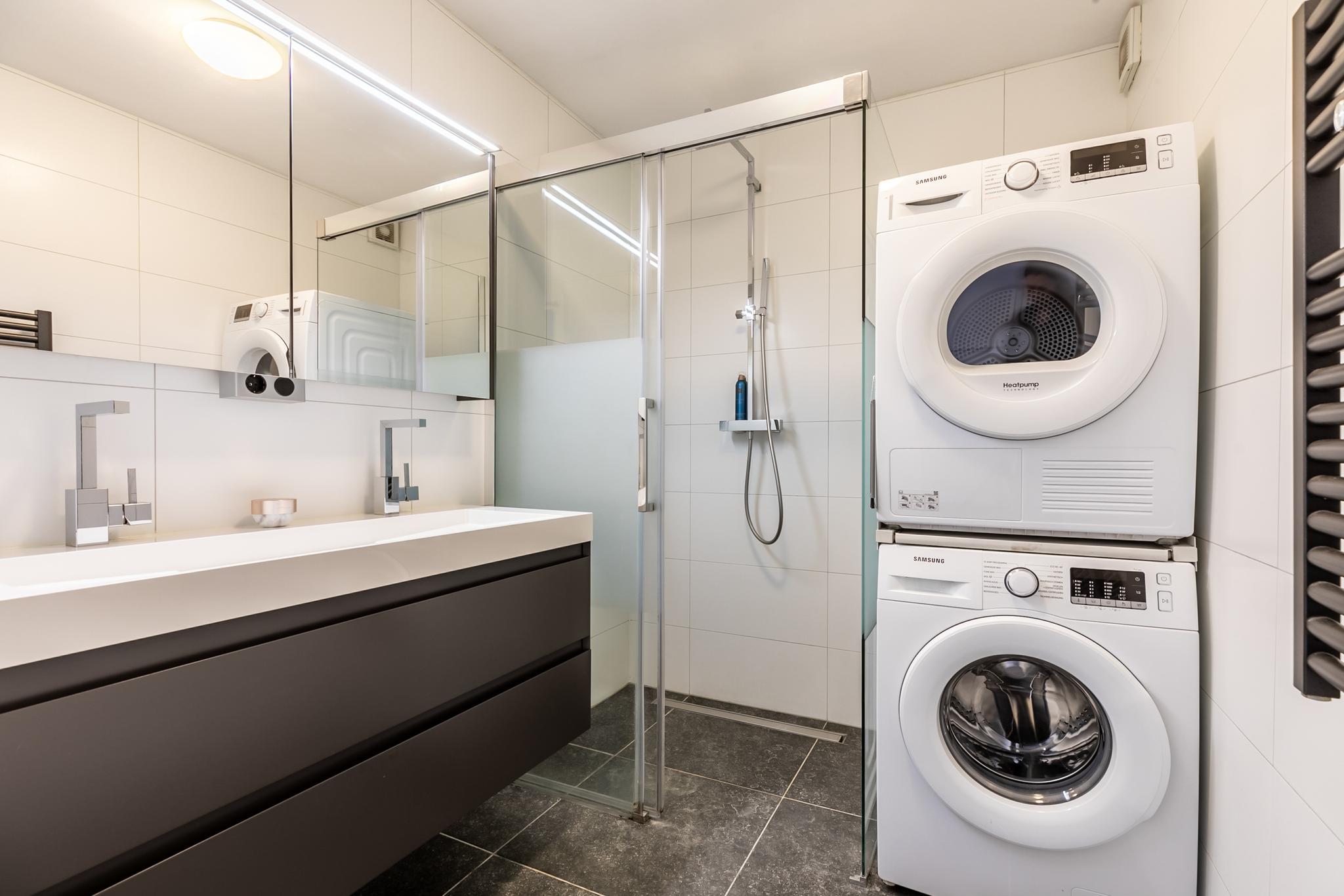 De royale en uitgebouwde badkamer is luxe uitgevoerd en beschikt over een ruime inloopdouche, een dubbele wastafel met meubel en aansluitingen voor zowel een wasmachine als droger. De afwerking is stijlvol en functioneel.