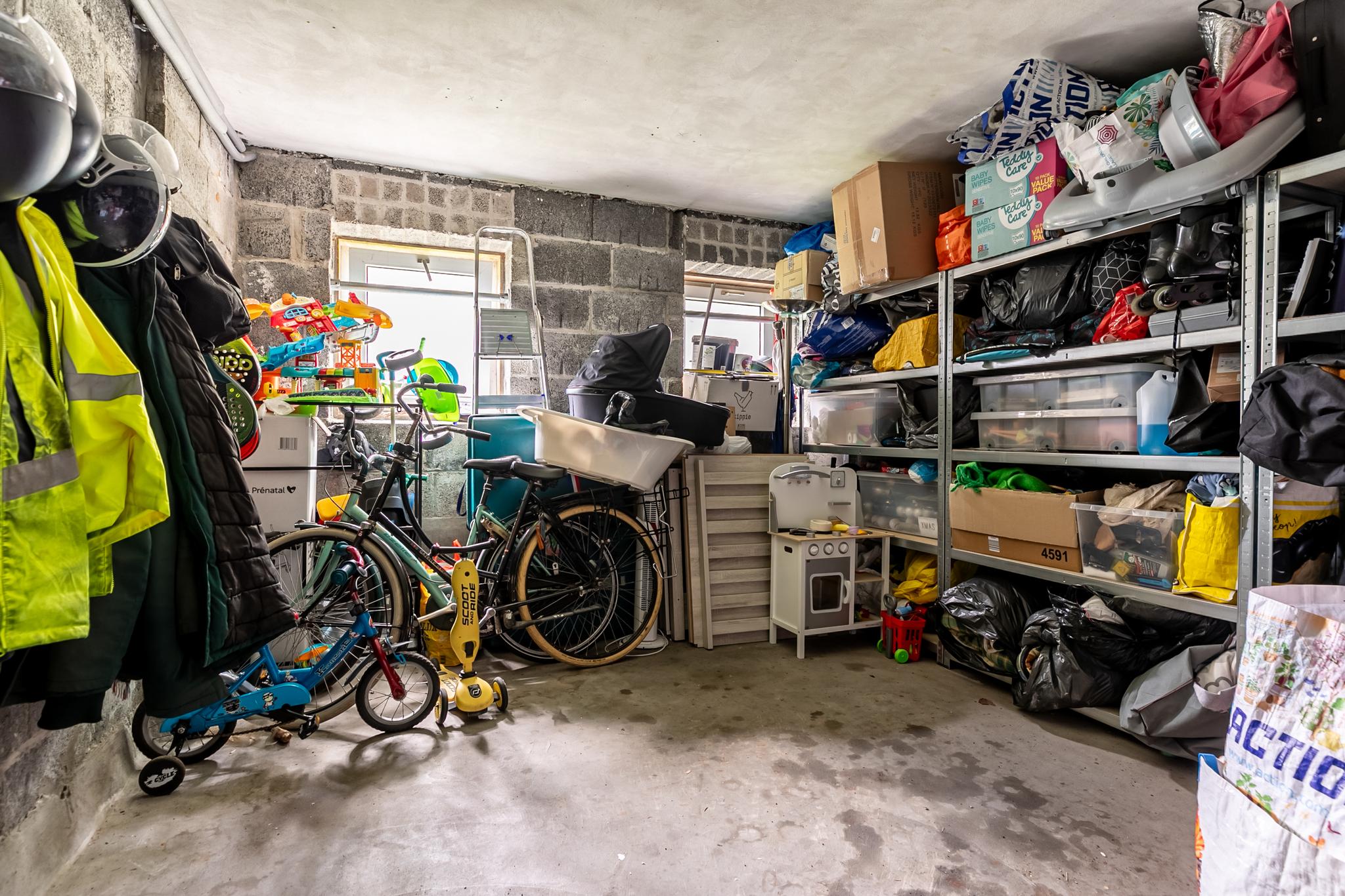 Begane grond: centrale entree met bellentableau en toegang tot de zeer ruime berging (ca. 16 m²) met ramen en eigen ingang aan de zijkant, ideaal voor fietsen of opslag.