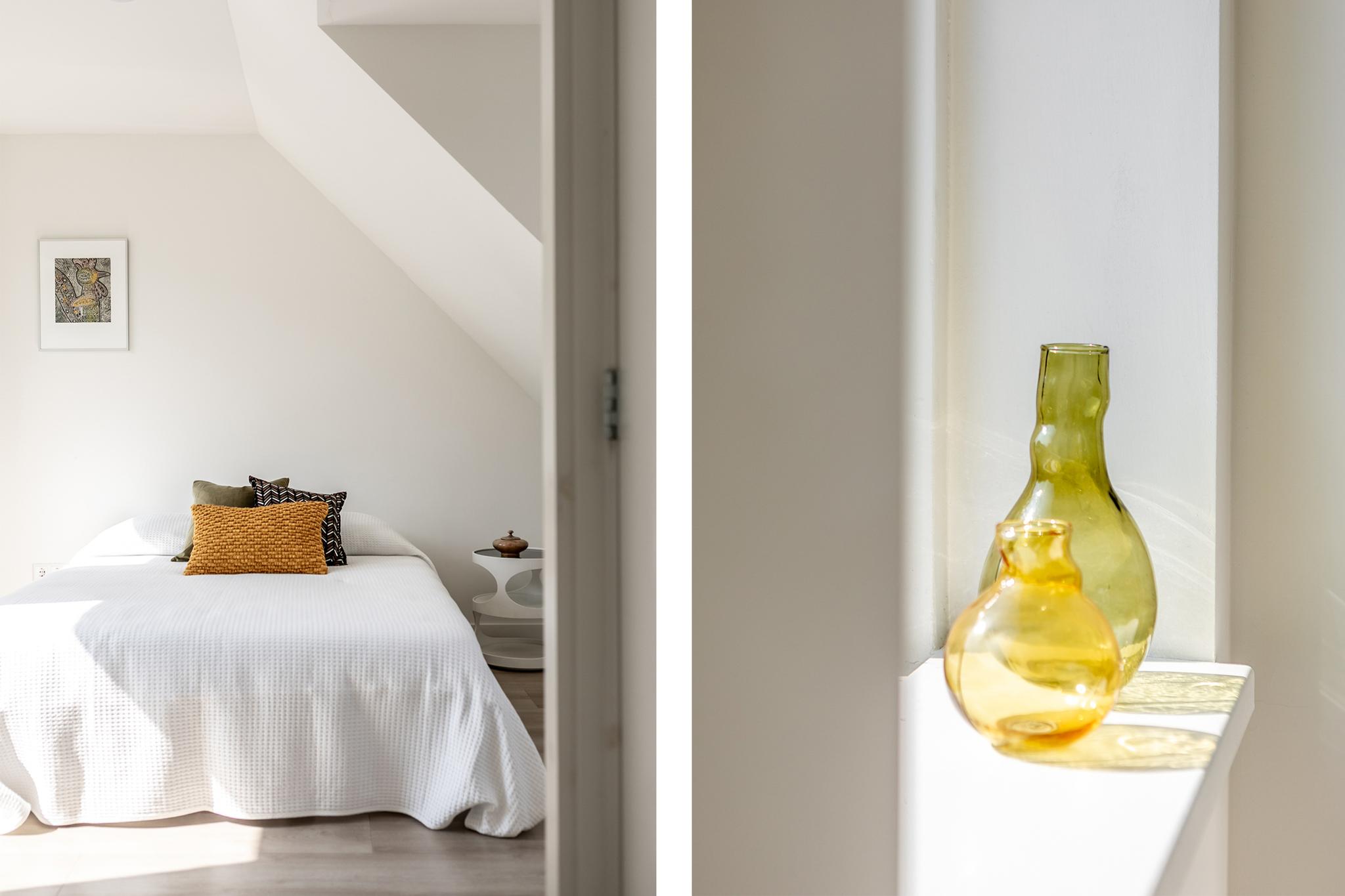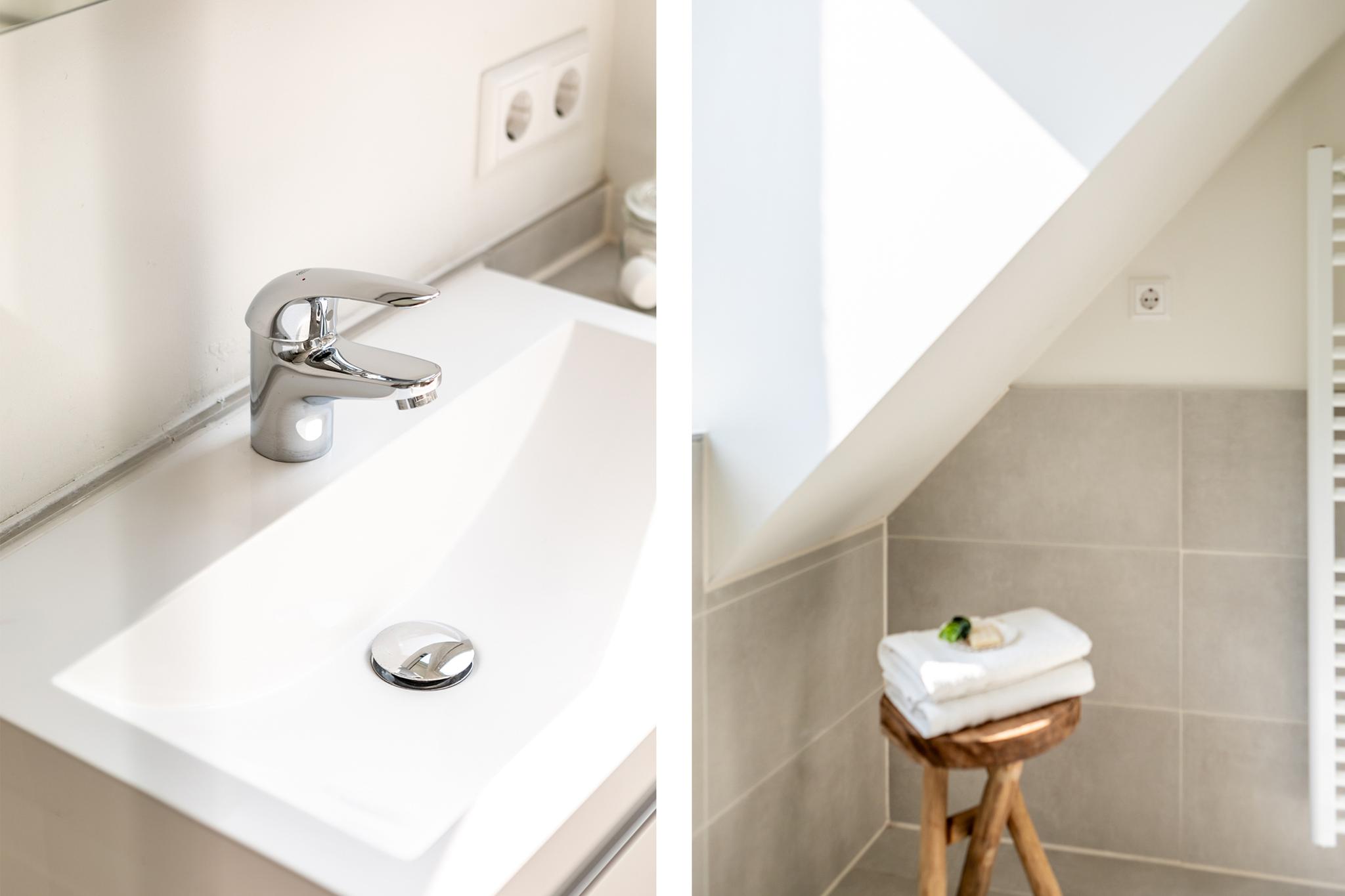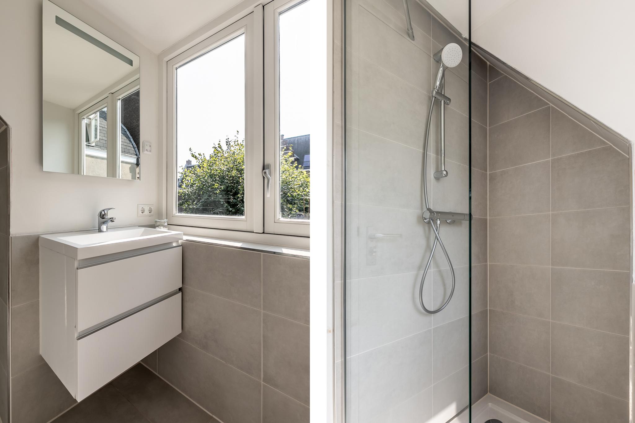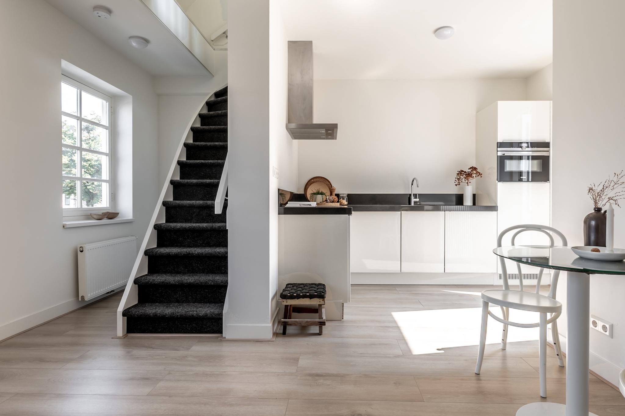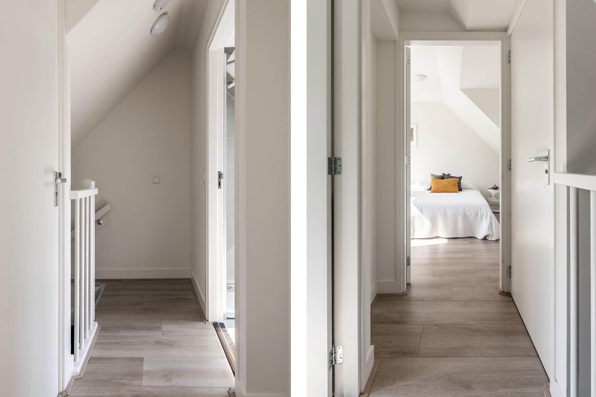 De trap in de woonkamer leidt naar de tweede verdieping, waar u de ruime slaapkamer vindt. Hier is ook de moderne badkamer, voorzien van een inloopdouche, toilet, designradiator en een stijlvol wastafelmeubel met spiegel.
