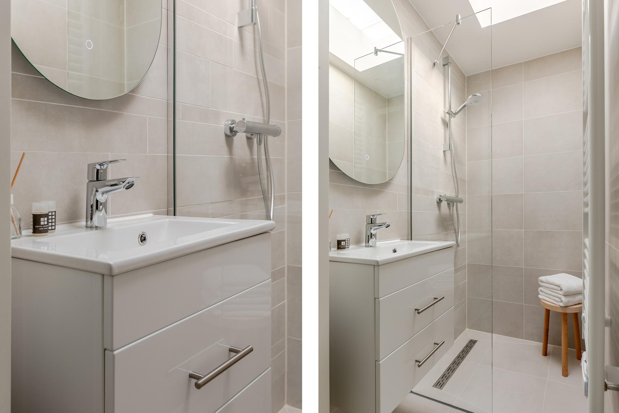 2e Verdieping: gezamenlijke hal, entree appartement, hal met toilet en badkamer voorzien van wastafel en inloopdouche.
