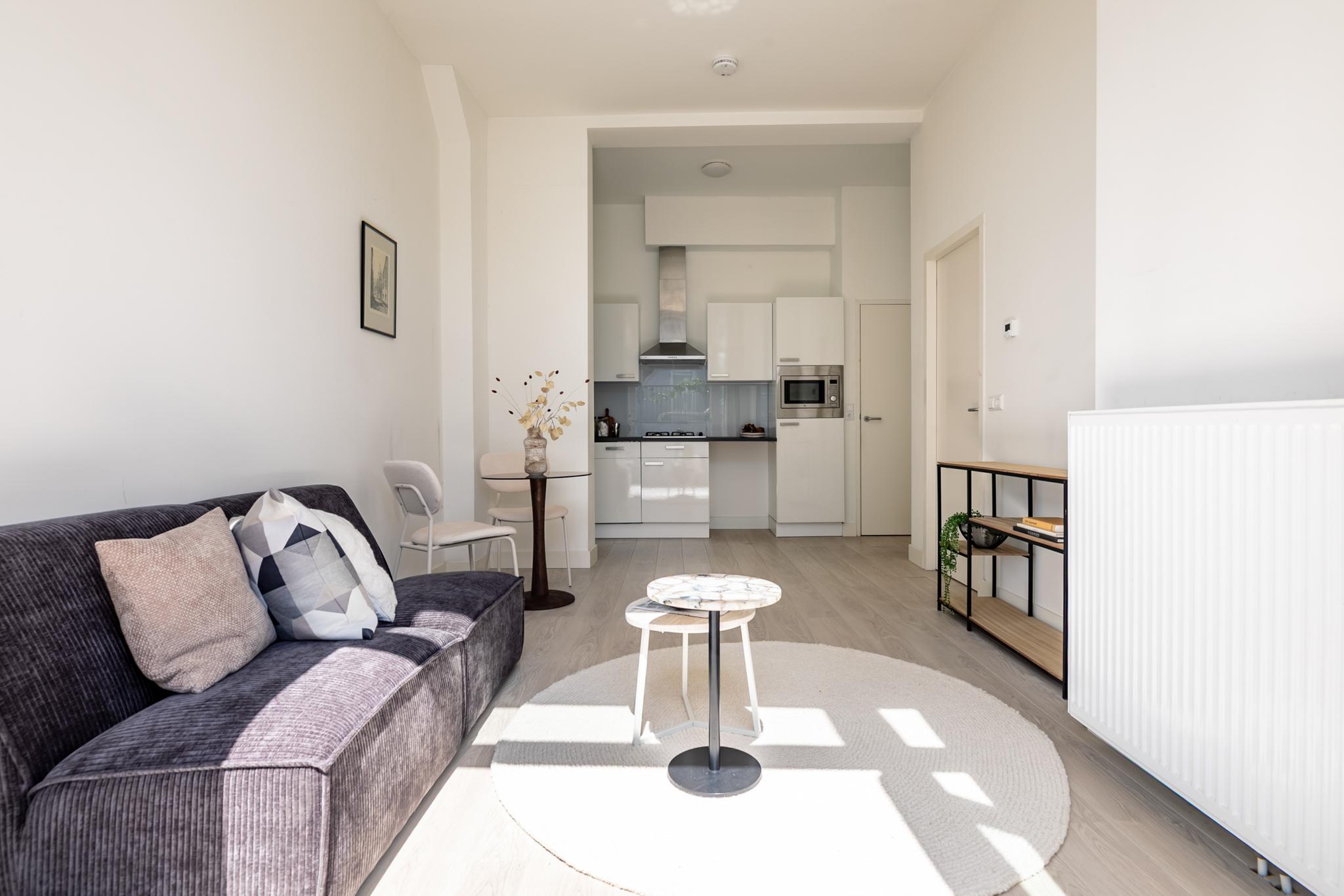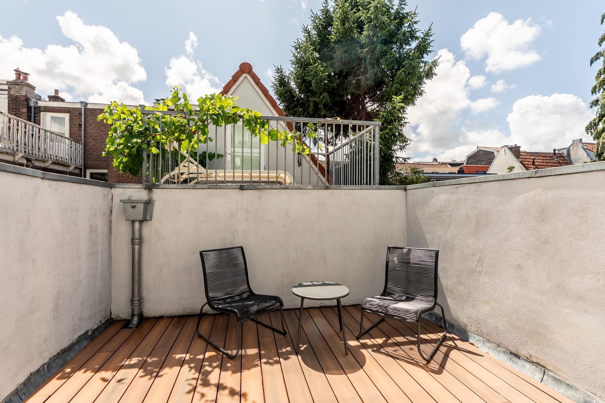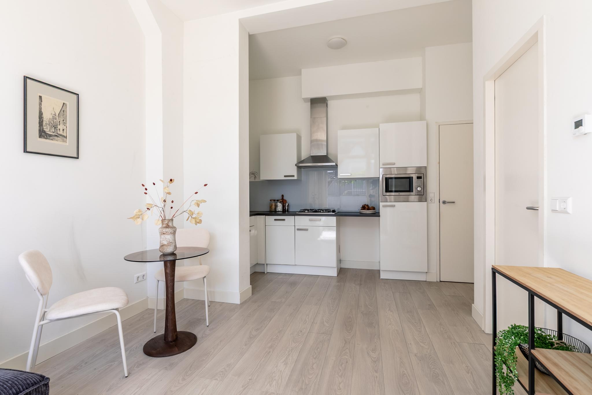 1e Verdieping: U treedt het appartement binnen in de hal, hier bevindt zich de badkamer die beschikt over een inloopdouche, wastafel met meubel, spiegel en designradiator en toilet. Via de hal komt u direct uit in de woonkamer met de moderne open keuken, welke is voorzien van diverse inbouwapparatuur. De slaapkamer is via de woonkamer te bereiken. Het dakterras is bereikbaar via de woonkamer. Het gehele pand inclusief de appartementen zijn in 2018 volledig gerenoveerd en gerestaureerd.