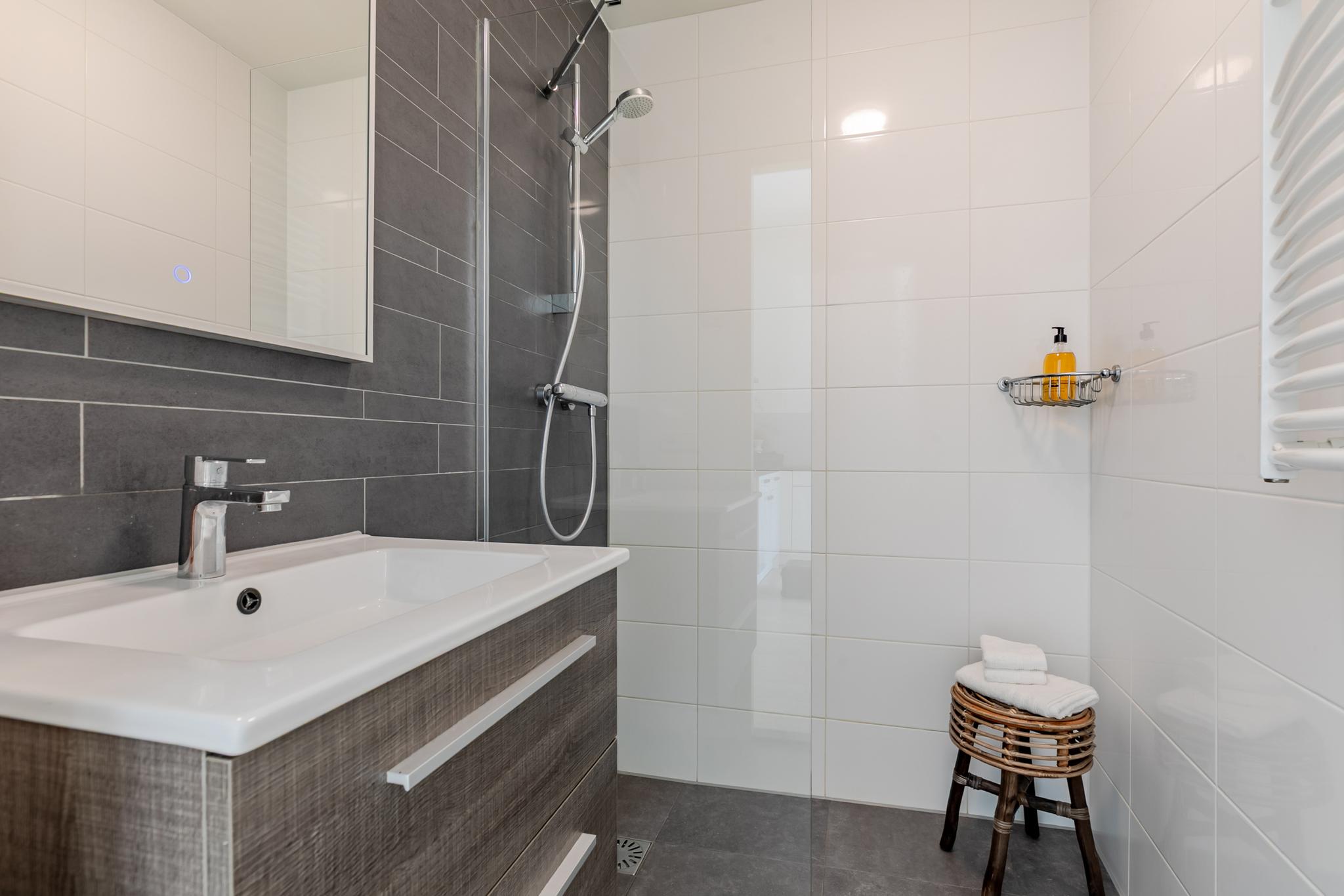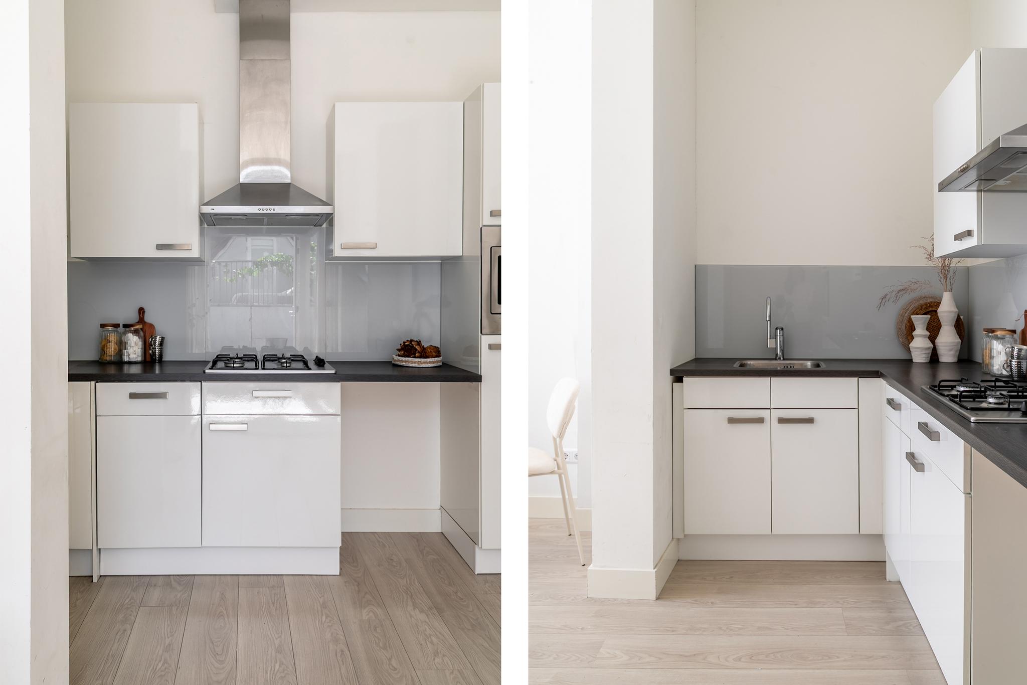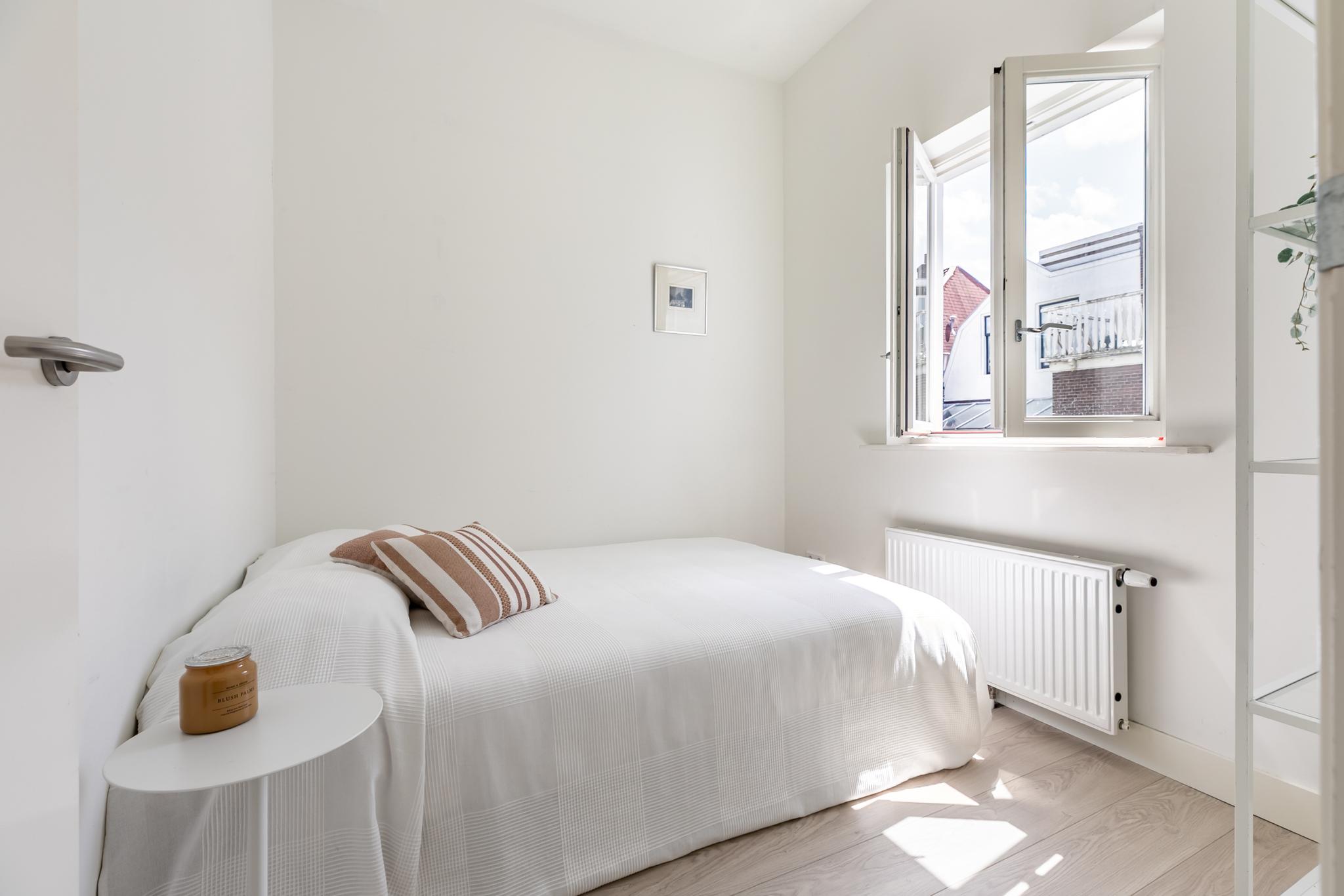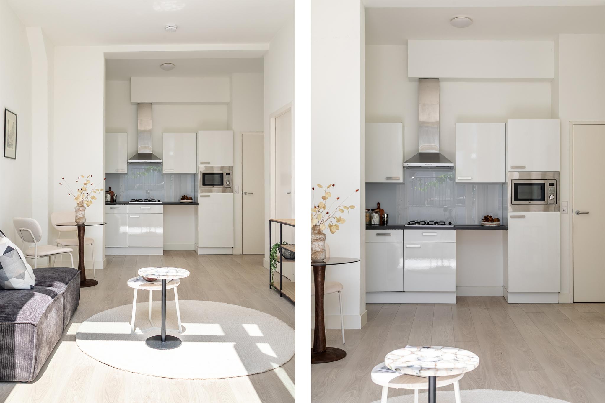 1e Verdieping: U treedt het appartement binnen in de hal, hier bevindt zich de badkamer die beschikt over een inloopdouche, wastafel met meubel, spiegel en designradiator en toilet. Via de hal komt u direct uit in de woonkamer met de moderne open keuken, welke is voorzien van diverse inbouwapparatuur. De slaapkamer is via de woonkamer te bereiken. Het dakterras is bereikbaar via de woonkamer. Het gehele pand inclusief de appartementen zijn in 2018 volledig gerenoveerd en gerestaureerd.