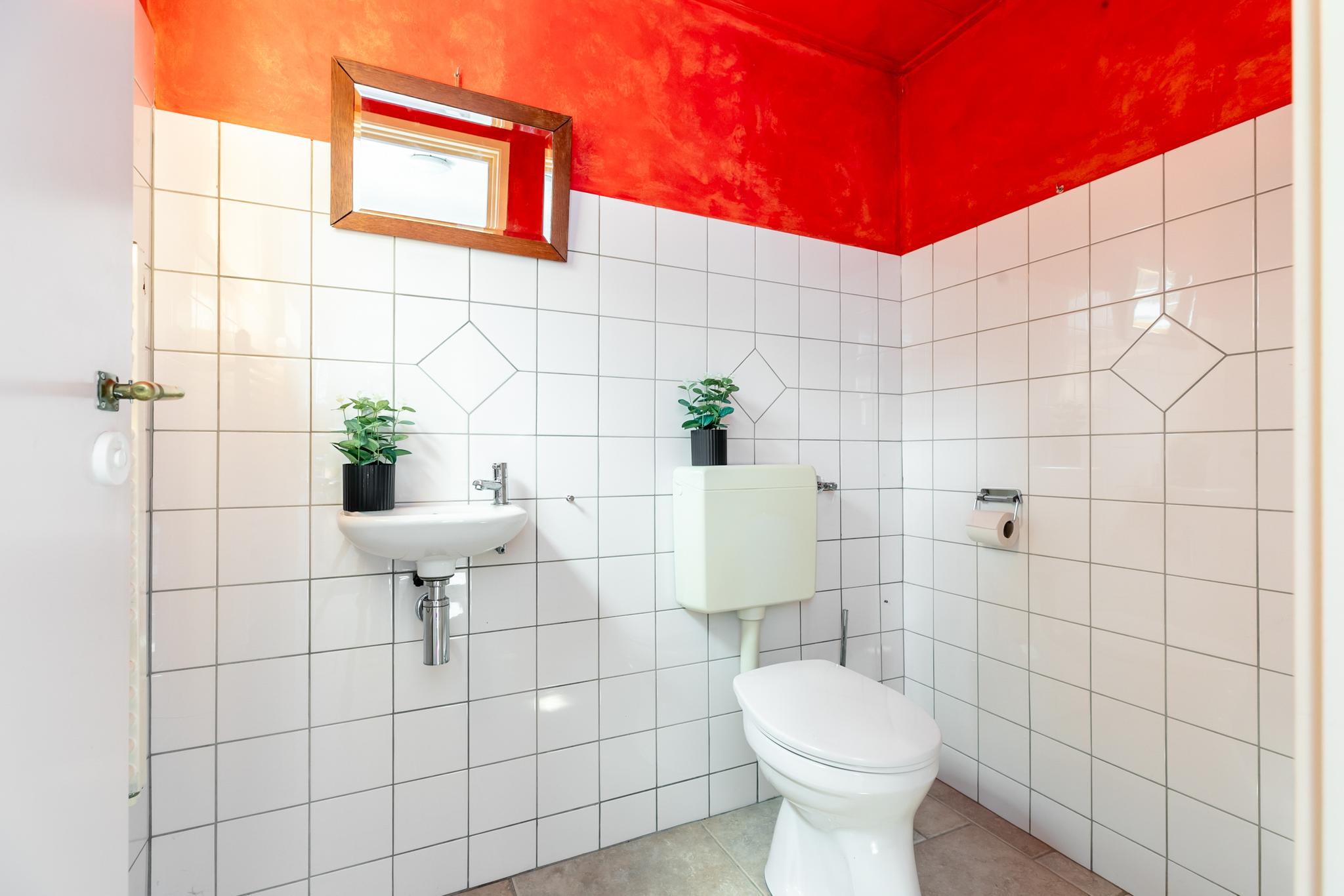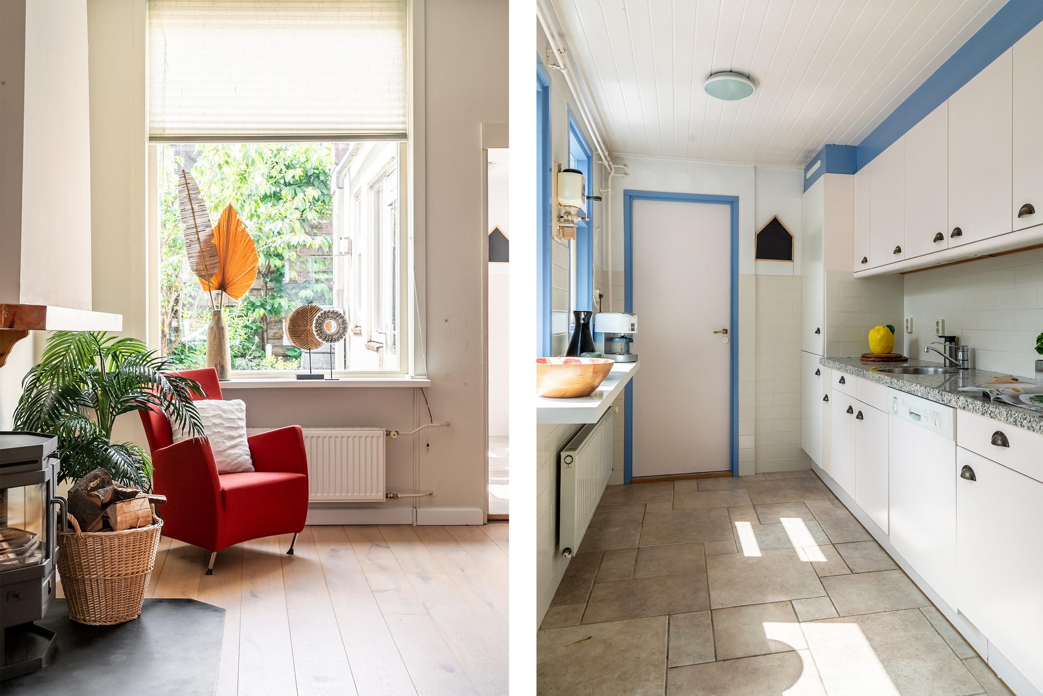 De woonkamer voelt dankzij de hoge plafonds extra ruim aan en heeft die fijne, lichte sfeer die zo kenmerkend is voor woningen uit deze bouwperiode. Enkele jaren geleden is de vloer vervangen door een geïsoleerde betonvloer – een investering die bijdraagt aan het wooncomfort, maar (nog) niet is opgenomen in het energielabel. In de uitbouw vind je de eenvoudige, maar functionele keuken met aansluitend het toilet. Vanuit hier stap je zo de achtertuin in.