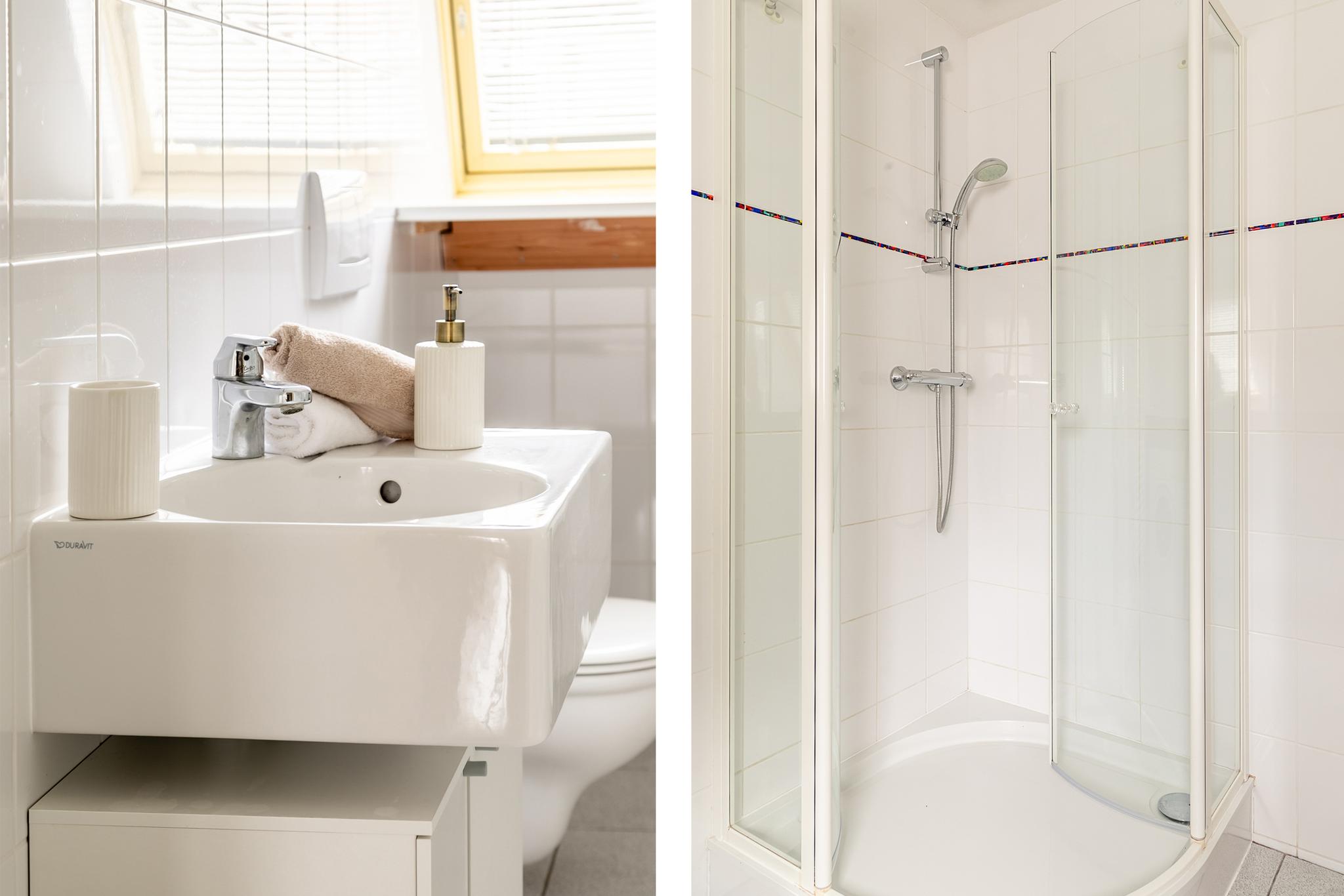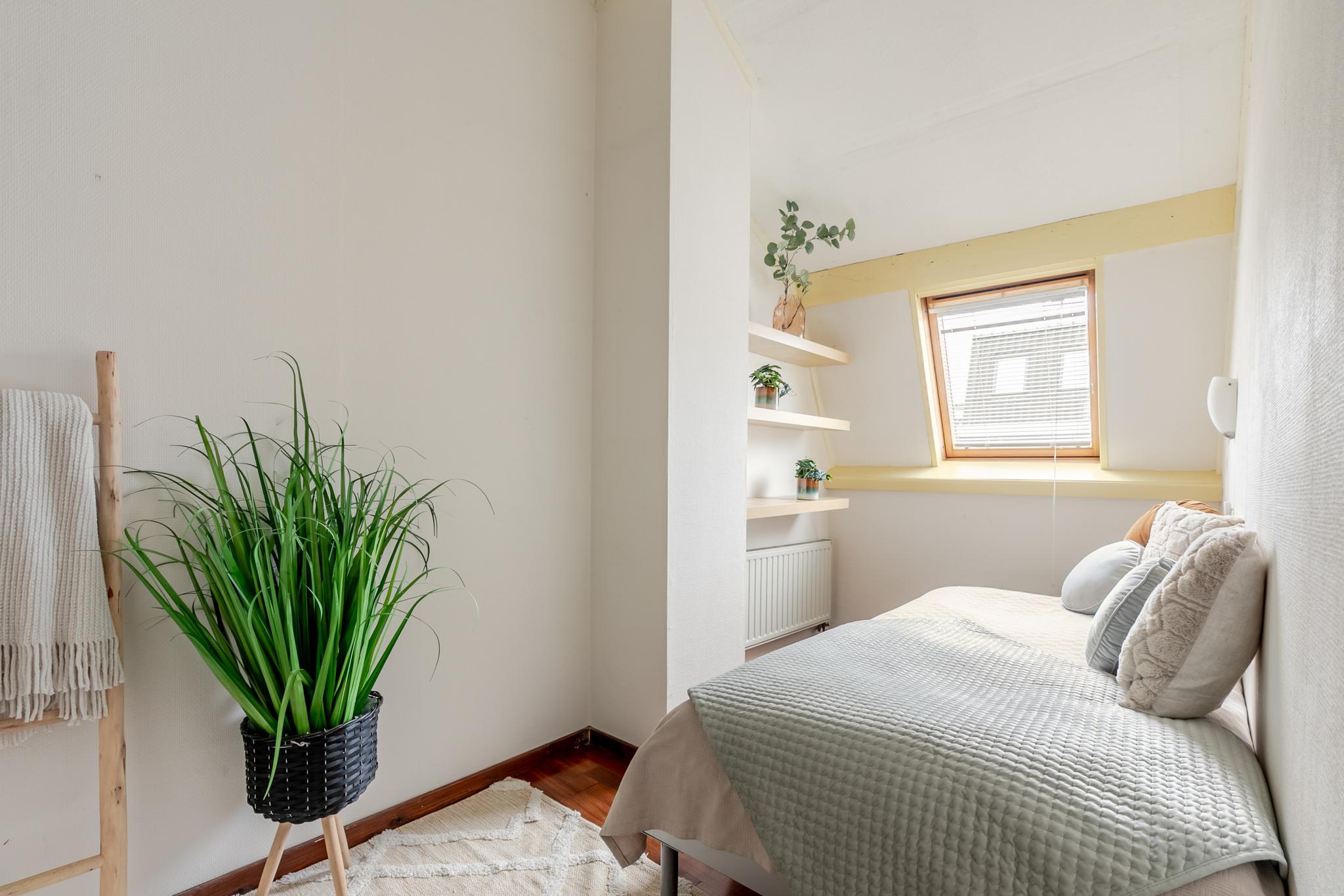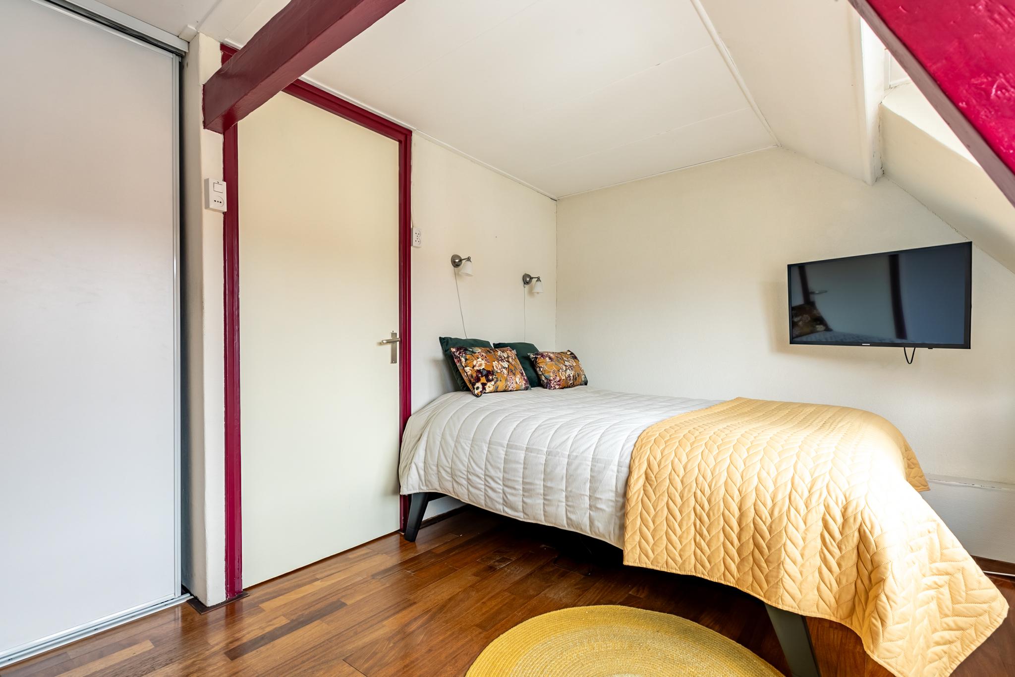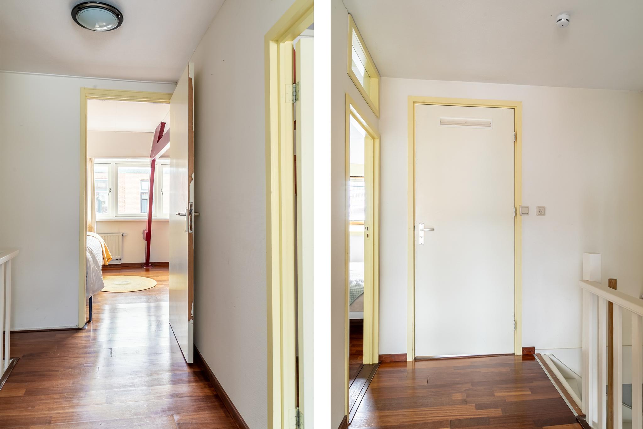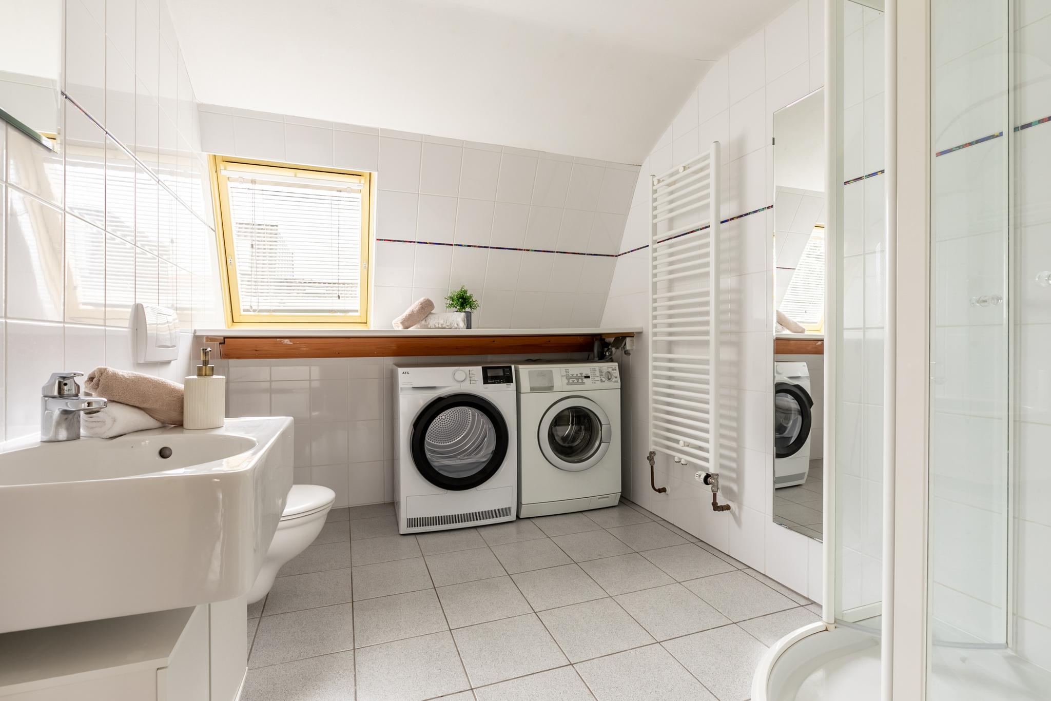 Op de eerste verdieping bevindt zich aan de voorzijde de hoofdslaapkamer, voorzien van een dakkapel. Aan de achterzijde vind je een tweede, kleinere slaapkamer – ideaal als werk- of kinderkamer – en de badkamer met douche, wastafel, tweede toilet en aansluitingen voor wasmachine en droger.