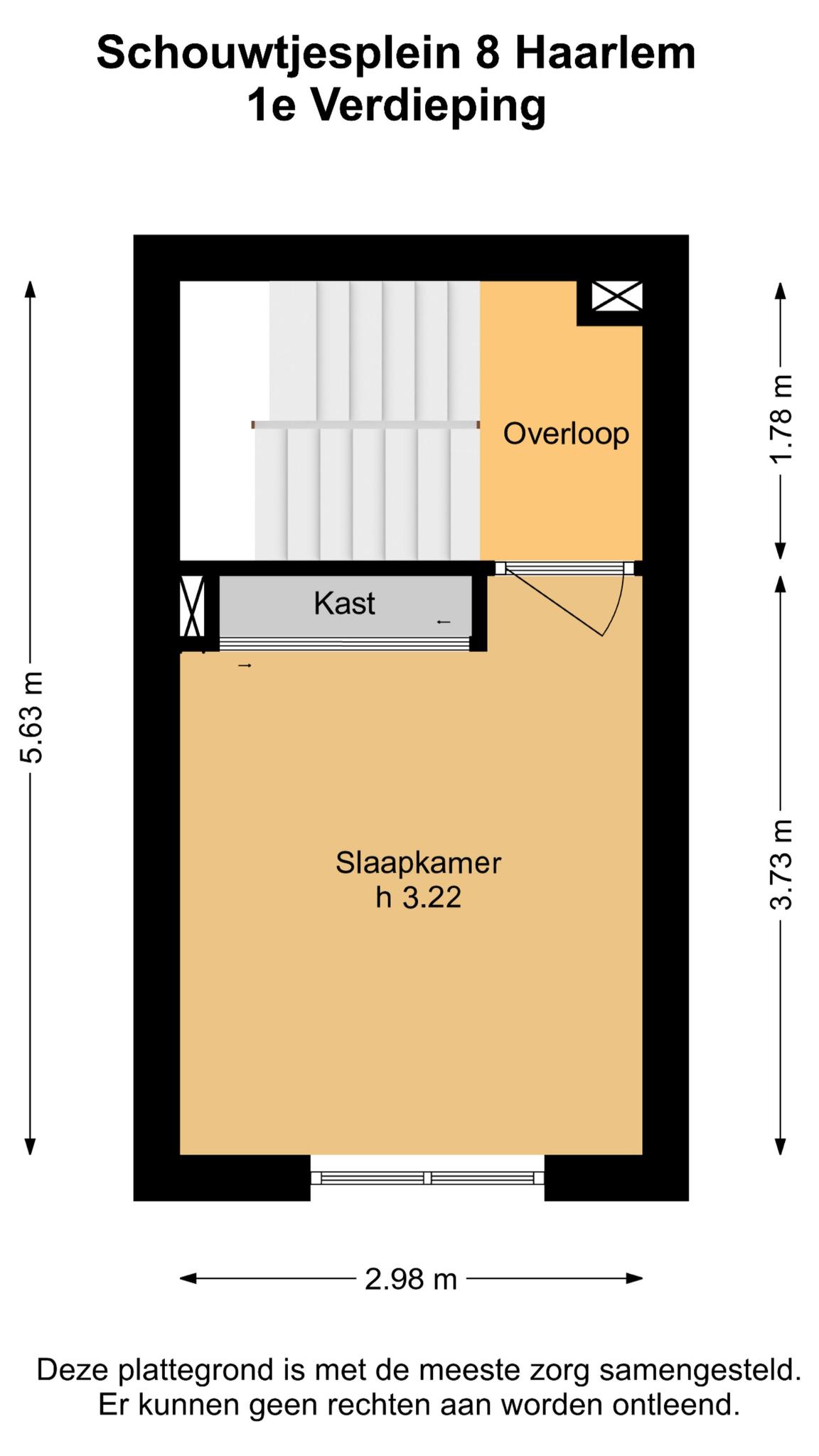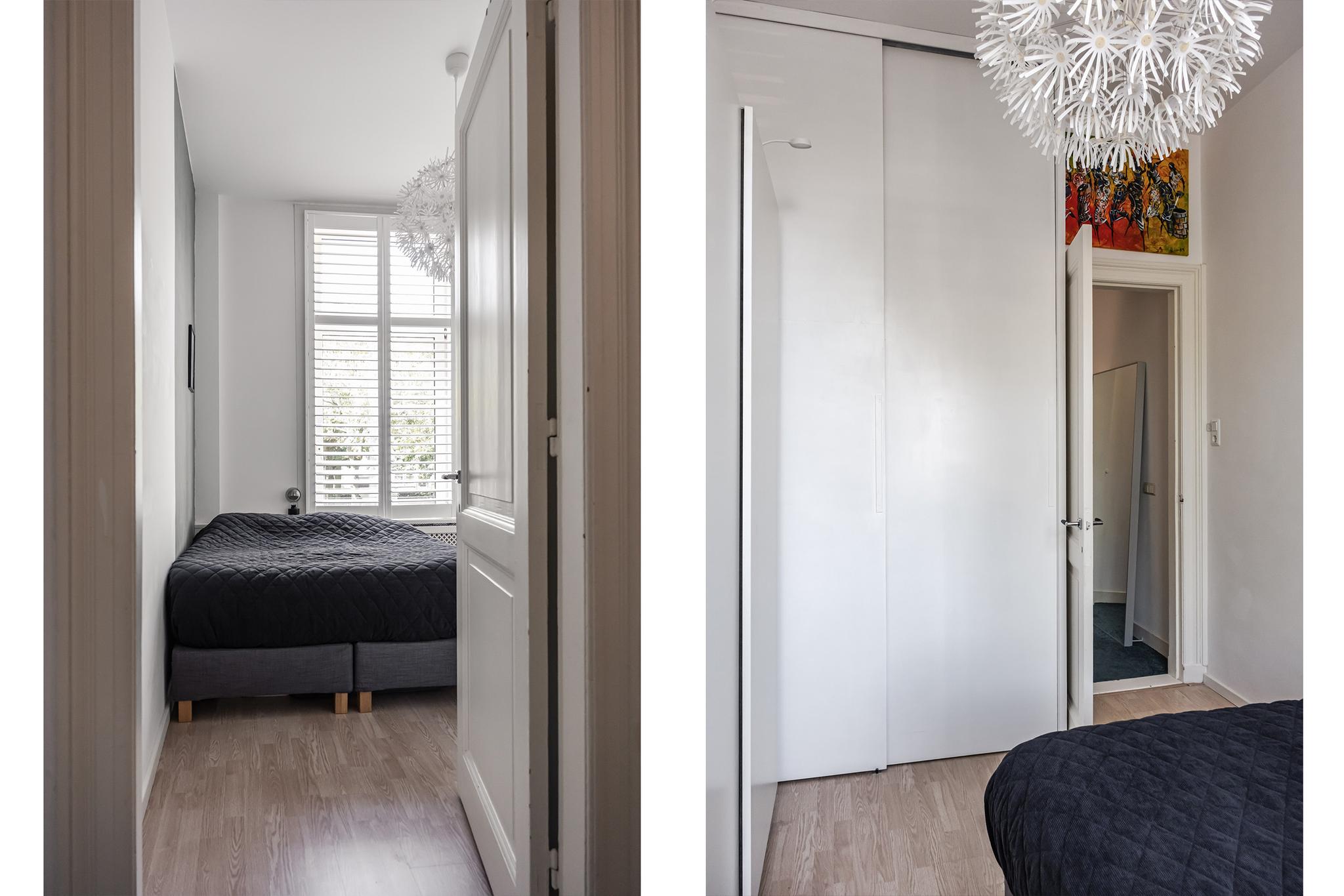 Overloop, 2e slaapkamer van 3,73 diep en 2.98 meter breed, met hoog plafond (veel licht), voorzien van een kastenwand tot aan het plafond en shutters voor de ramen (laminaatvloer).