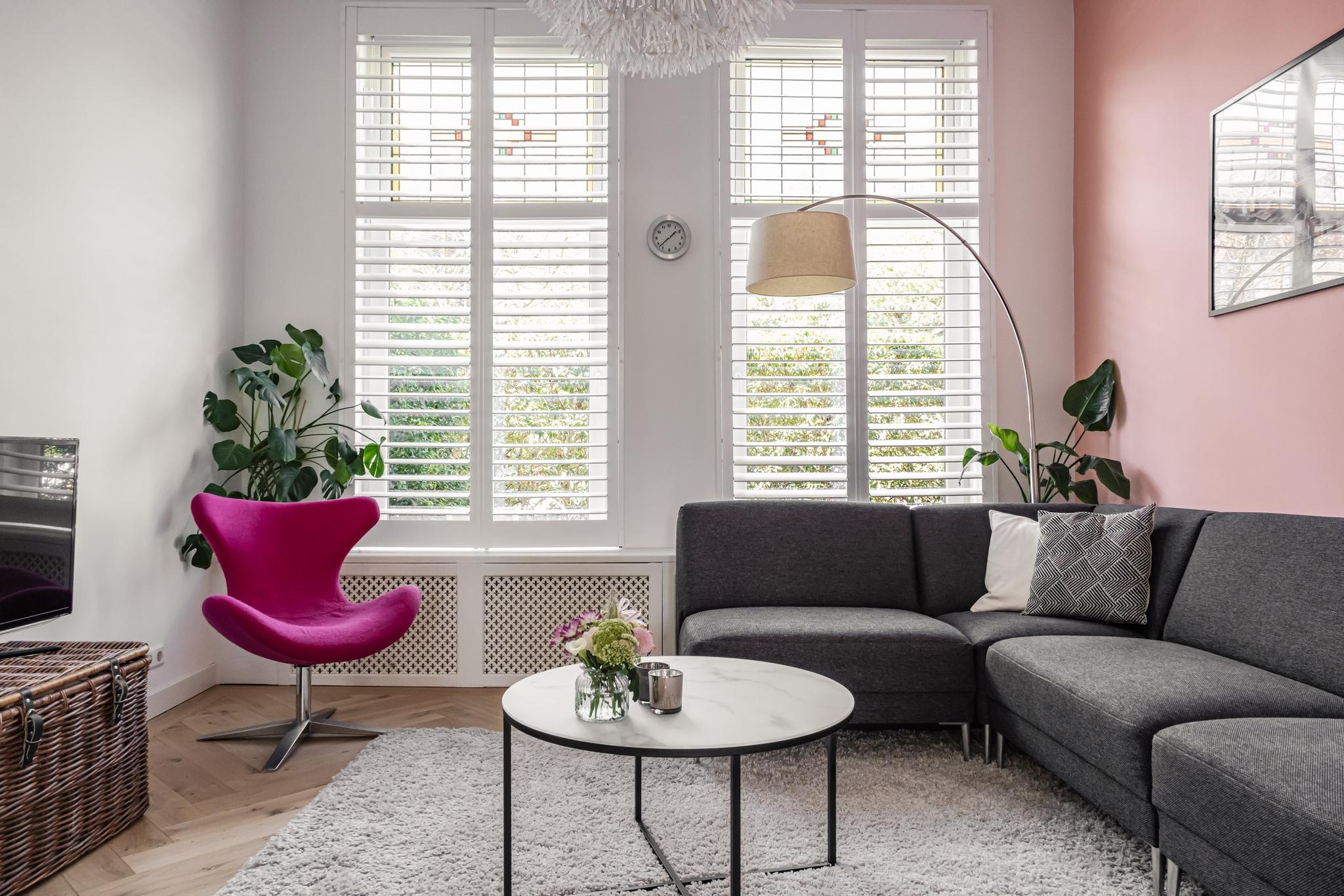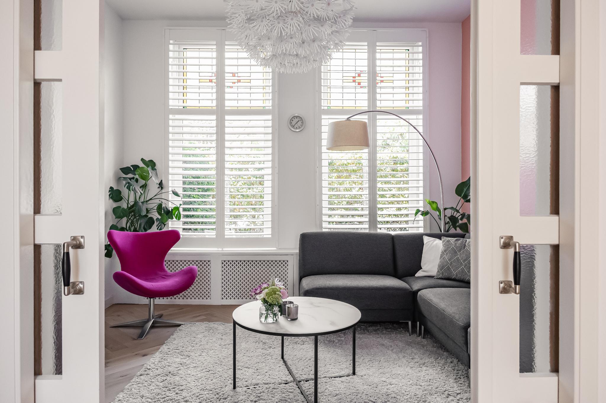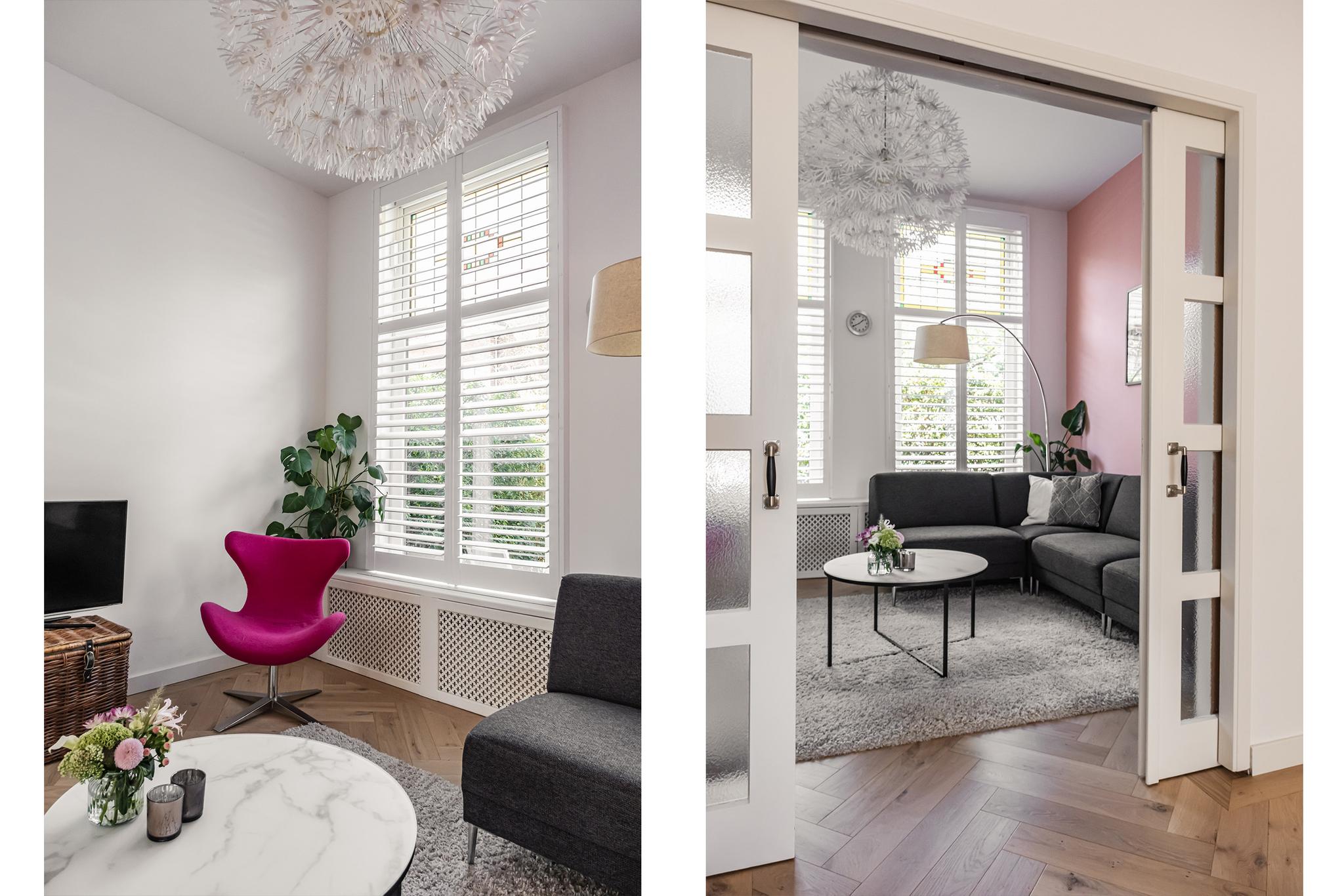 Riante woon-/eetkamer en suite van maar liefst ruim 49 m². De ruimte is op meerdere manieren te gebruiken en voorzien van een fraaie (geïsoleerde) visgraad gelegde eiken parketvloer en shutters voor de ramen met glas in lood aan de voorzijde.