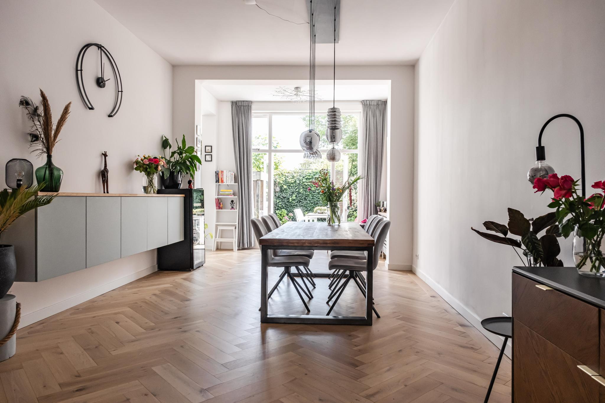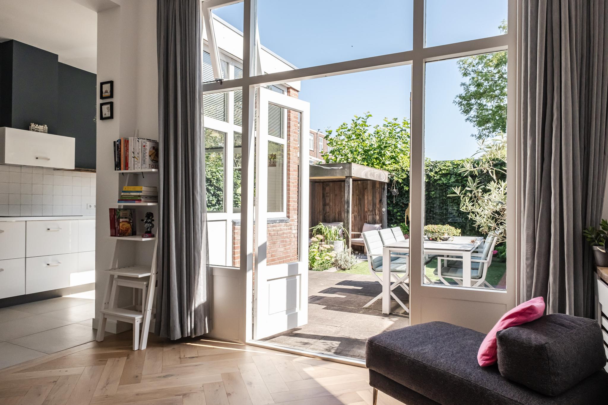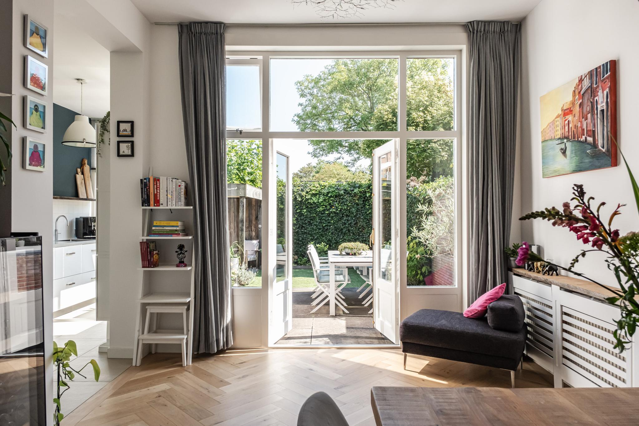 Aan de achterzijde bevindt zich een grote woon-eetkamer met openslaande deuren en de verbinding met de compleet uitgeruste keuken (2015; koelkast, vriezer, magnetron, oven, Quooker, inductiekookplaat, vaatwasser en afzuigkap).