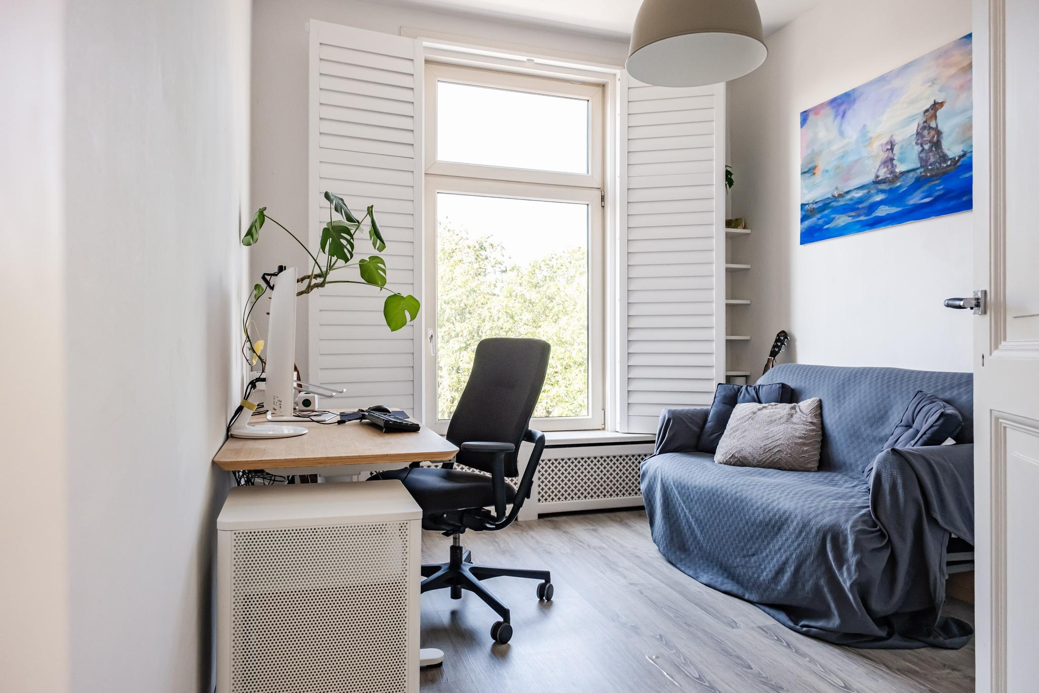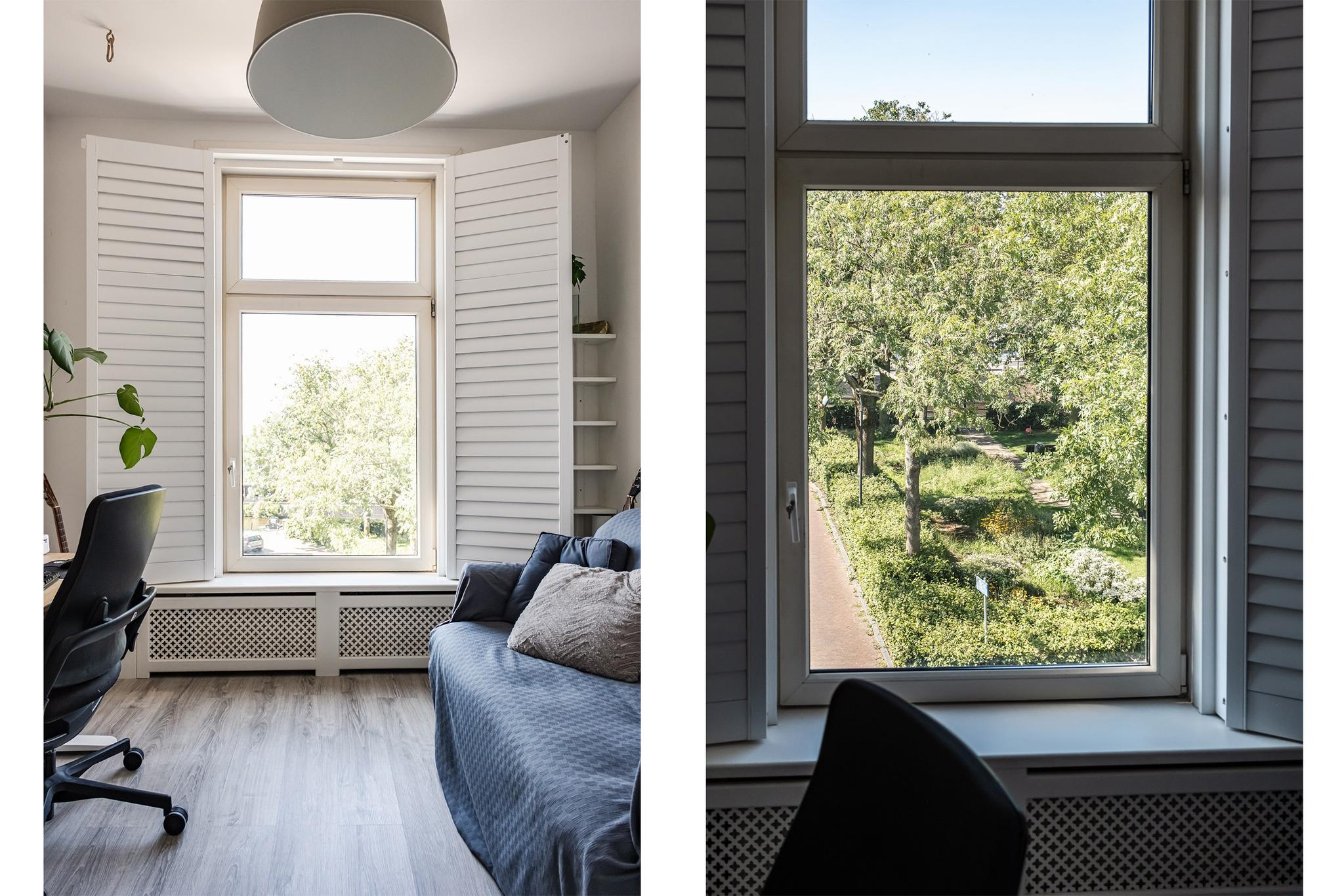 Overloop, vaste kast met c.v. opstelling, 3e slaapkamer van 3,72 diep en 2.97 meter breed, met hoog plafond, veel licht en voorzien van shutters voor de ramen (laminaatvloer),