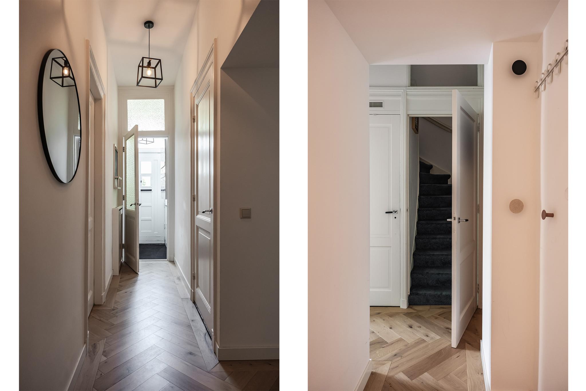 Entree via fraaie voordeur, vestibule met meterkast, diepe gang met bergkast, modern toilet met vrij hangend closet.
