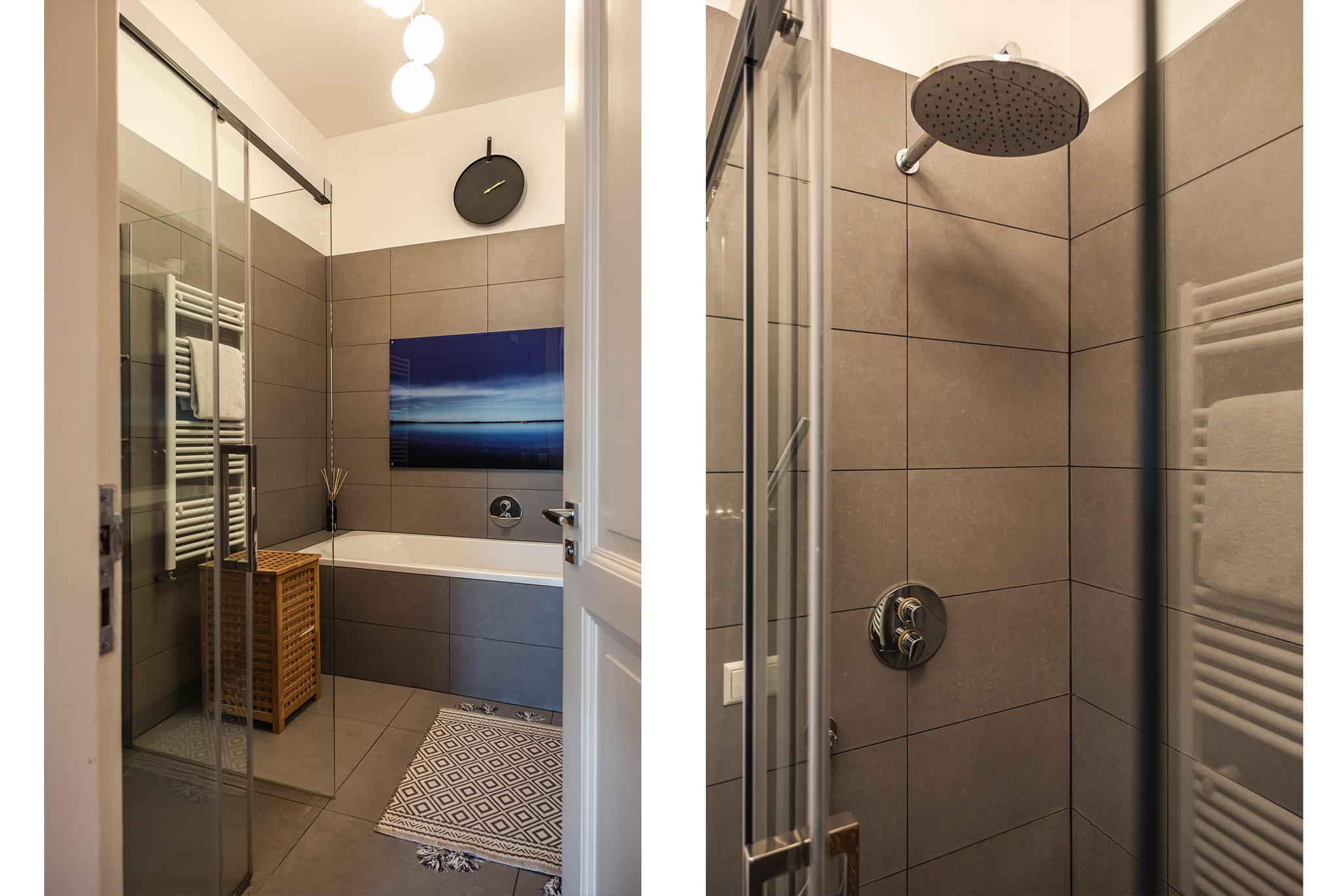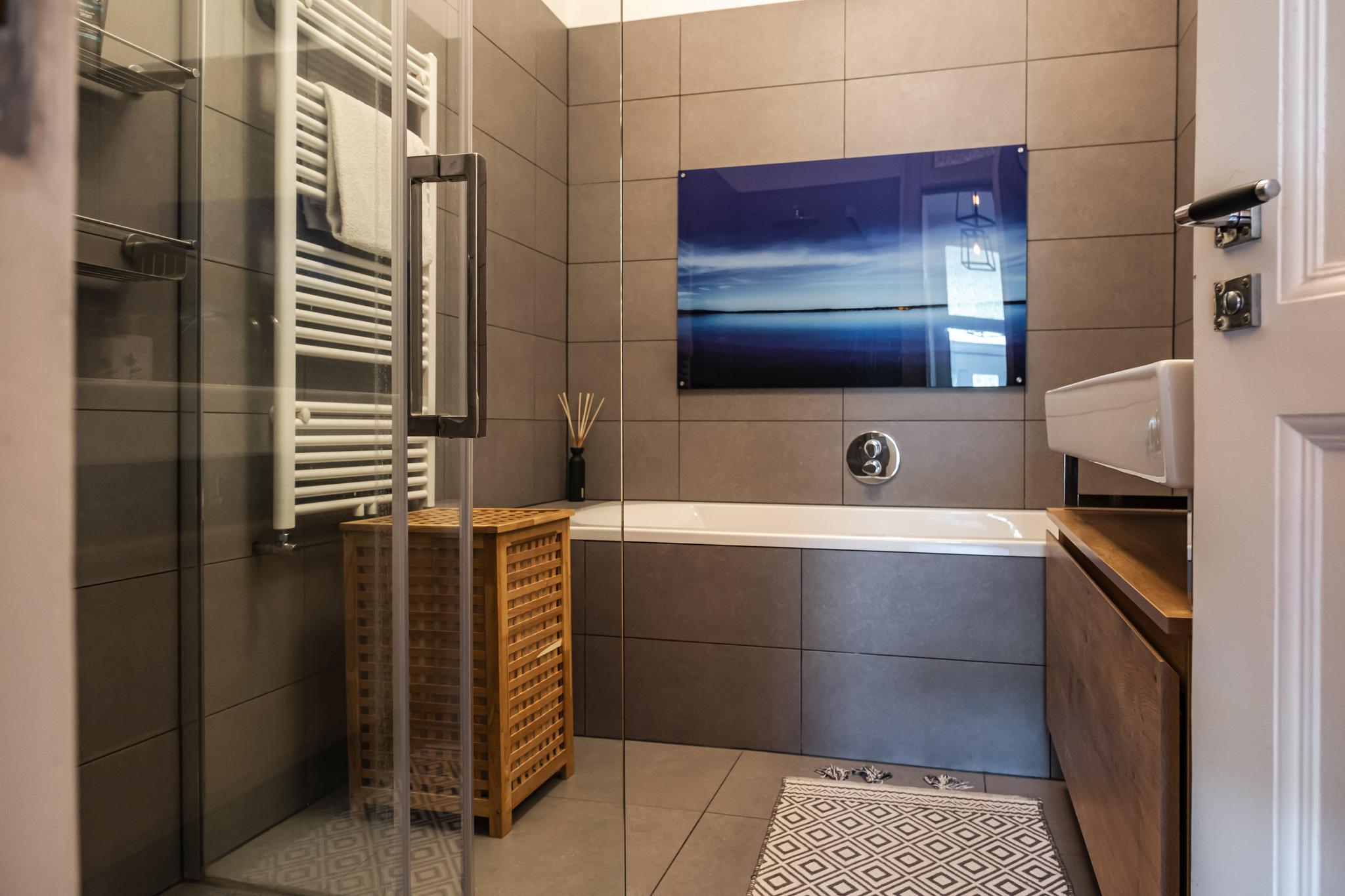 Vanuit de gang bij de entree zijn tevens een royale en moderne badkamer (2015; ligbad, inloopdouche, dubbele vaste wastafel met ombouwmeubel), een lichte slaapkamer en de kast met wasmachine-aansluiting bereikbaar.