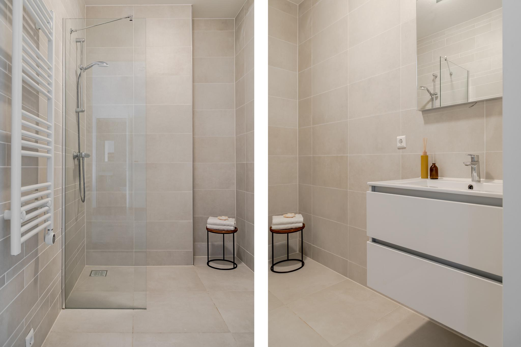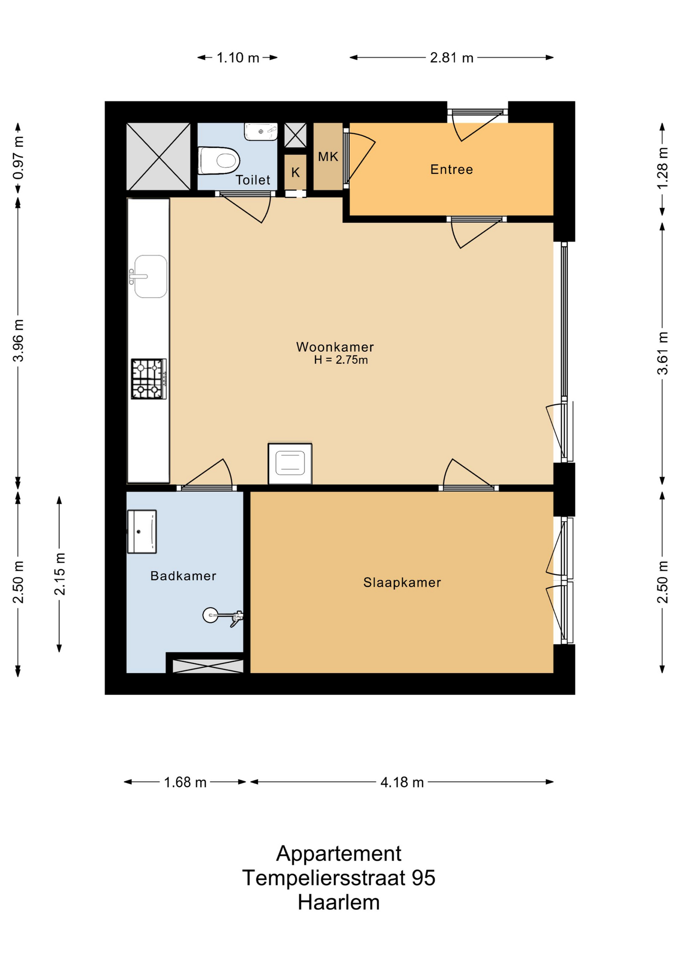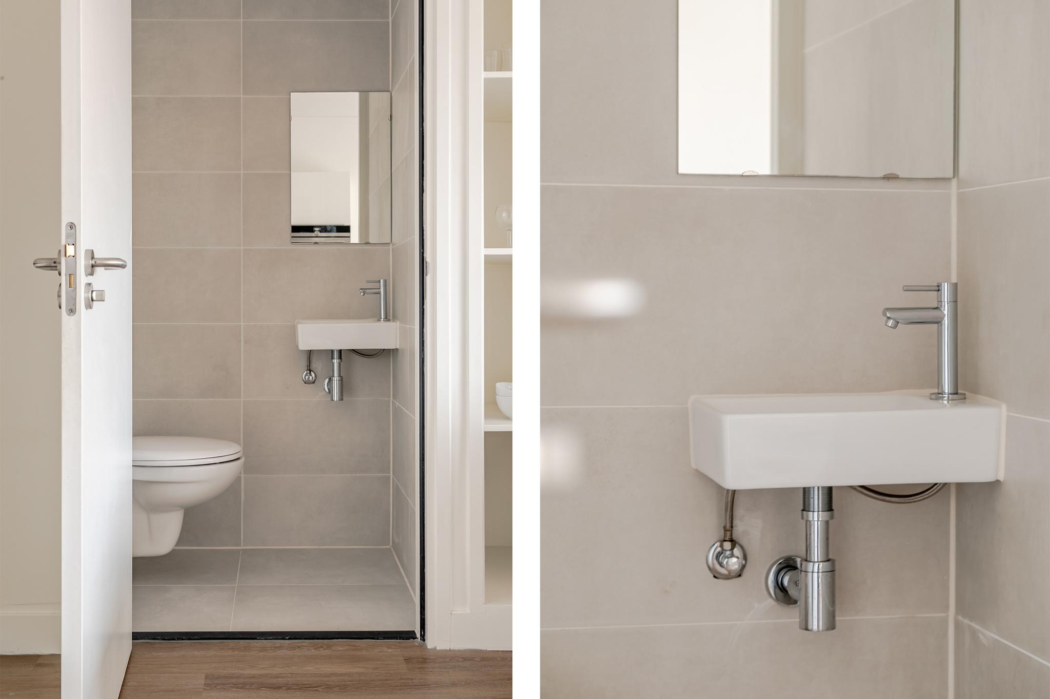 entree woning, woonkamer met open keuken voorzien van inbouwapparatuur en ingebouwde was-/droogmachine, toilet met fontijn, badkamer met inloopdouche, wastafelmeubel en spiegel, slaapkamer.
