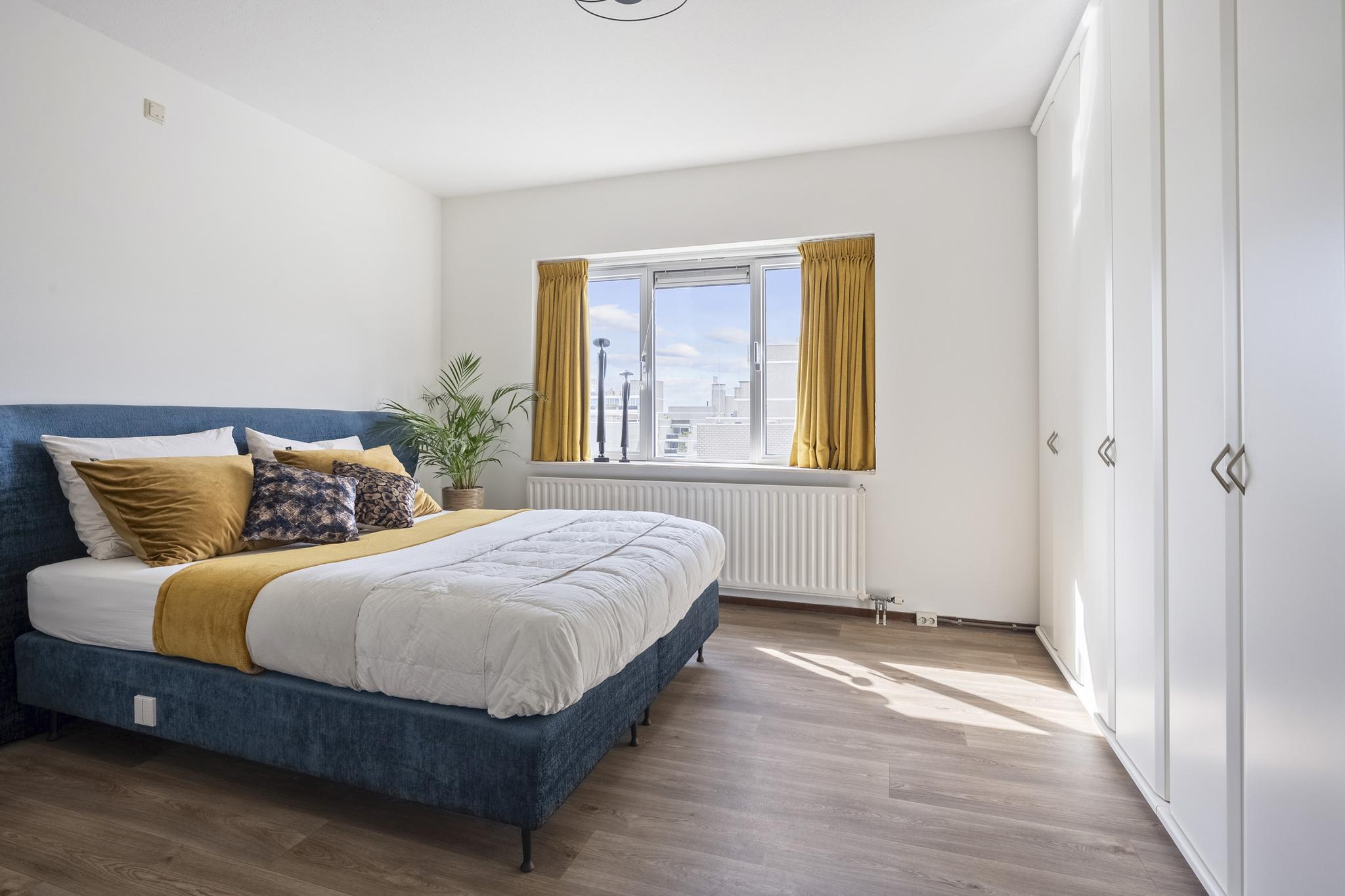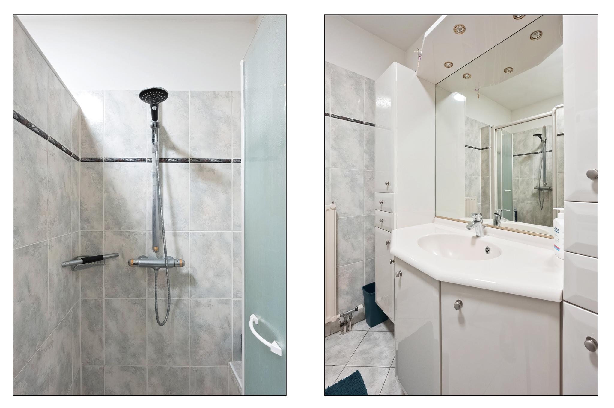 5e etage: ruime entree met vaste kast, royale Z-vormige woonkamer met toegang tot 2 terrassen, dichte keuken, hal, aparte toilet met fontein, badkamer met inloopdouche, wastafel en wasmachine-aansluiting, 2 goede slaapkamers.