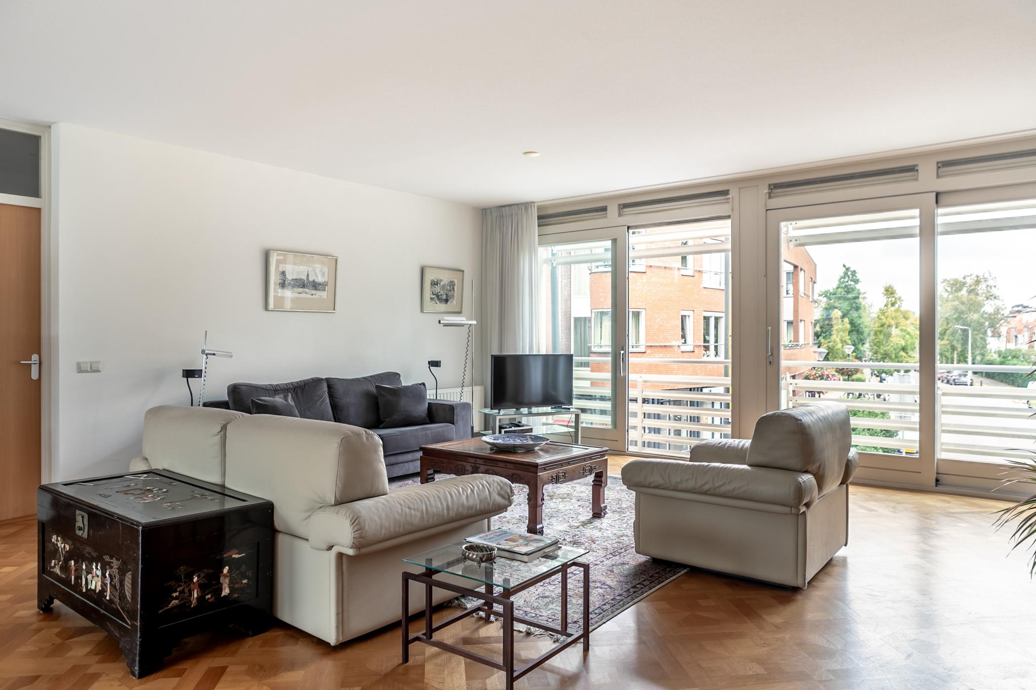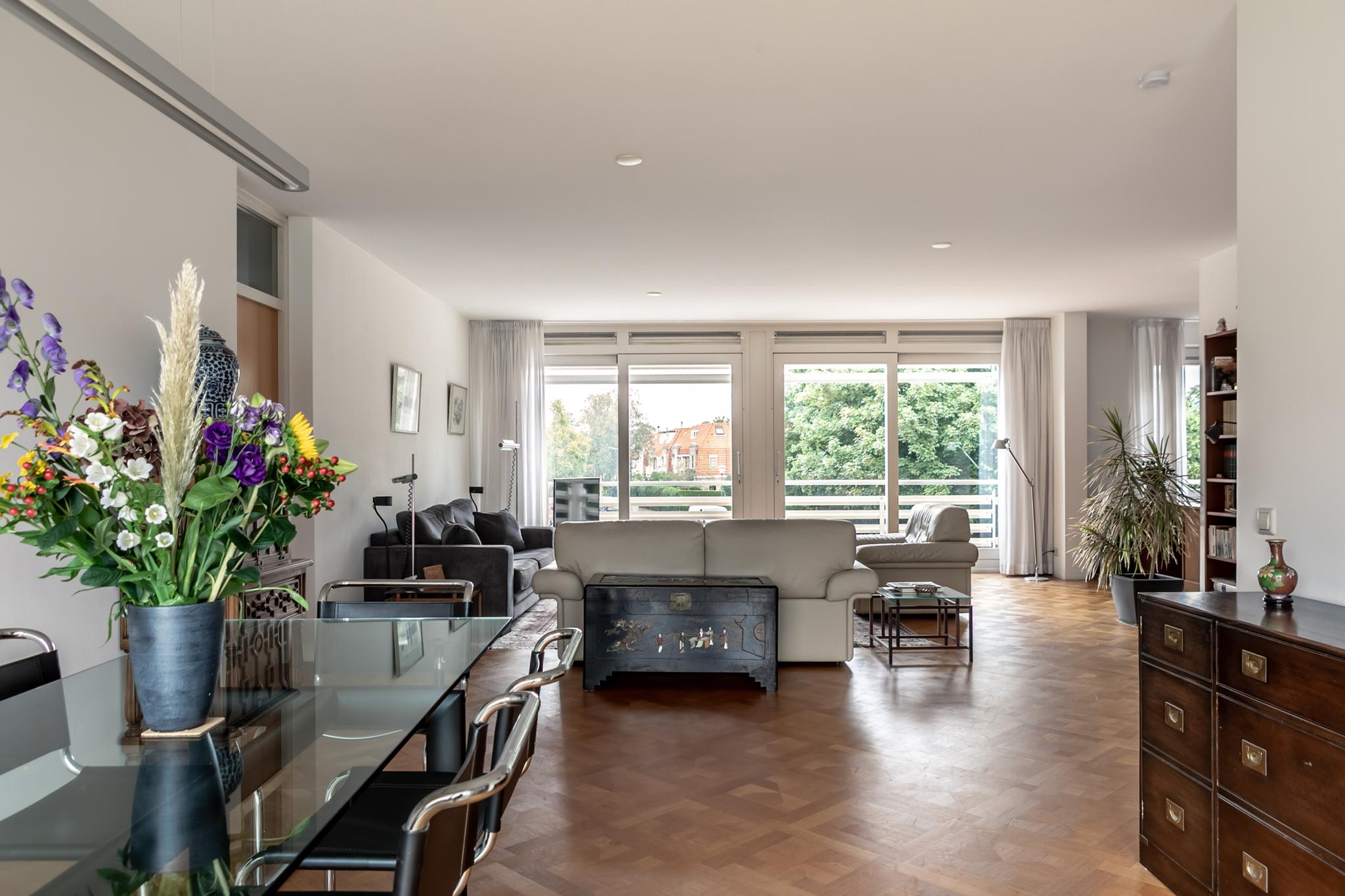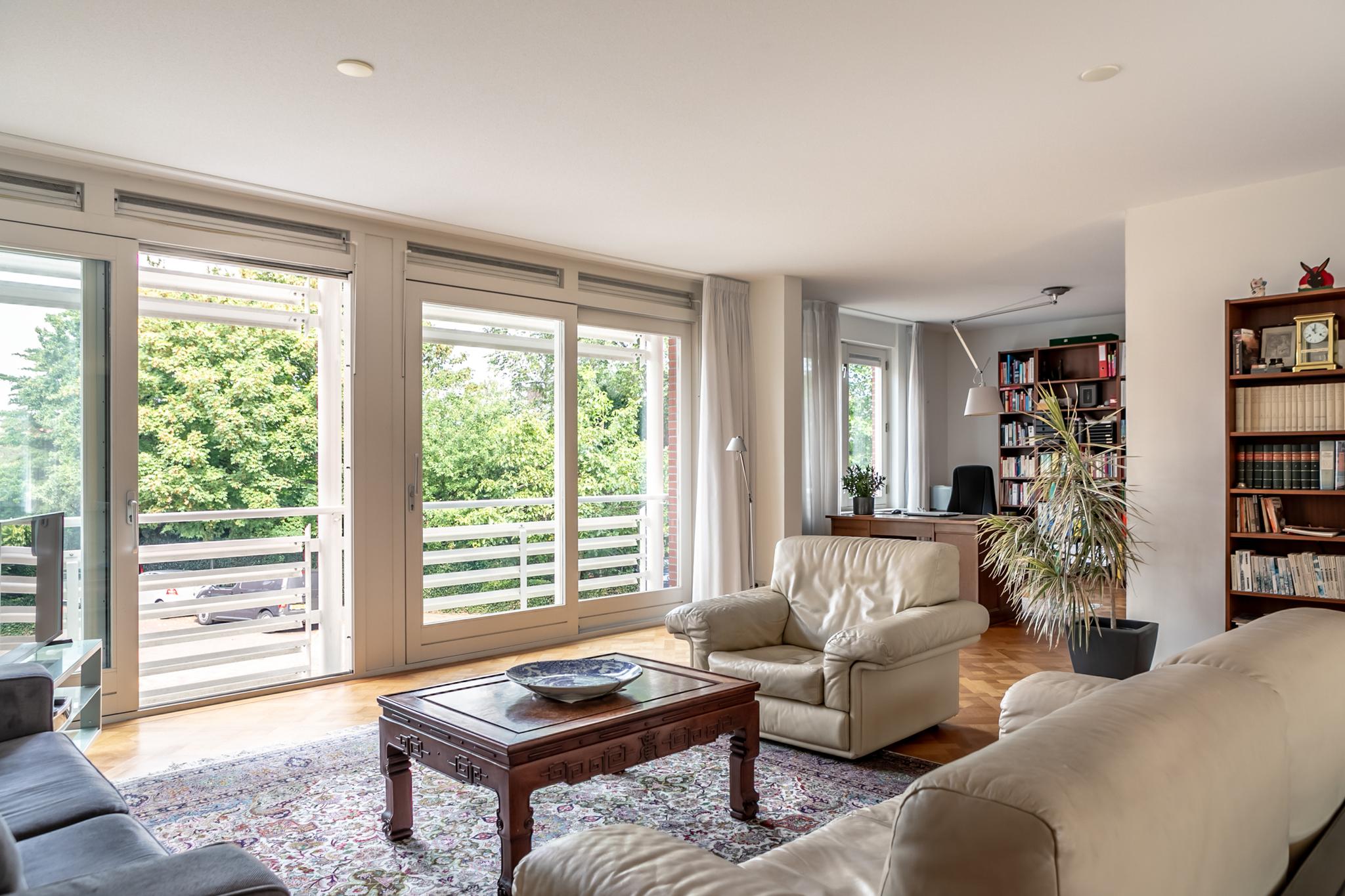 Zeer fraai, royaal appartement gelegen in het centrum van Heemstede met alle faciliteiten op loopafstand. Het appartement met energielabel A is gelegen op de 1e verdieping en heeft een ruim dakterras (ca. 52 m²) op het oosten. De ruime hal met toilet en garderobe geeft toegang tot de royale living met eikenhouten parket en grote raampartijen aan zowel de voor- als achterzijde en heeft een prachtige lichtinval. De living heeft een goede zithoek aan de voorzijde met vrij uitzicht en een aangrenzende study/werkkamer; de eethoek aan de achterzijde geeft toegang tot het royale dakterras en tot de half open keuken. Naast de keuken bevinden zich een multifunctionele ruimte die heel goed als hobby- of extra werk/slaapkamer kan worden gebruikt en ook nog een inpandige berging met wasruimte. Aan de andere kant van het appartement liggen de slaapvertrekken met eigen hal die toegang geeft tot 2 goede slaapkamers en 2 badkamers.