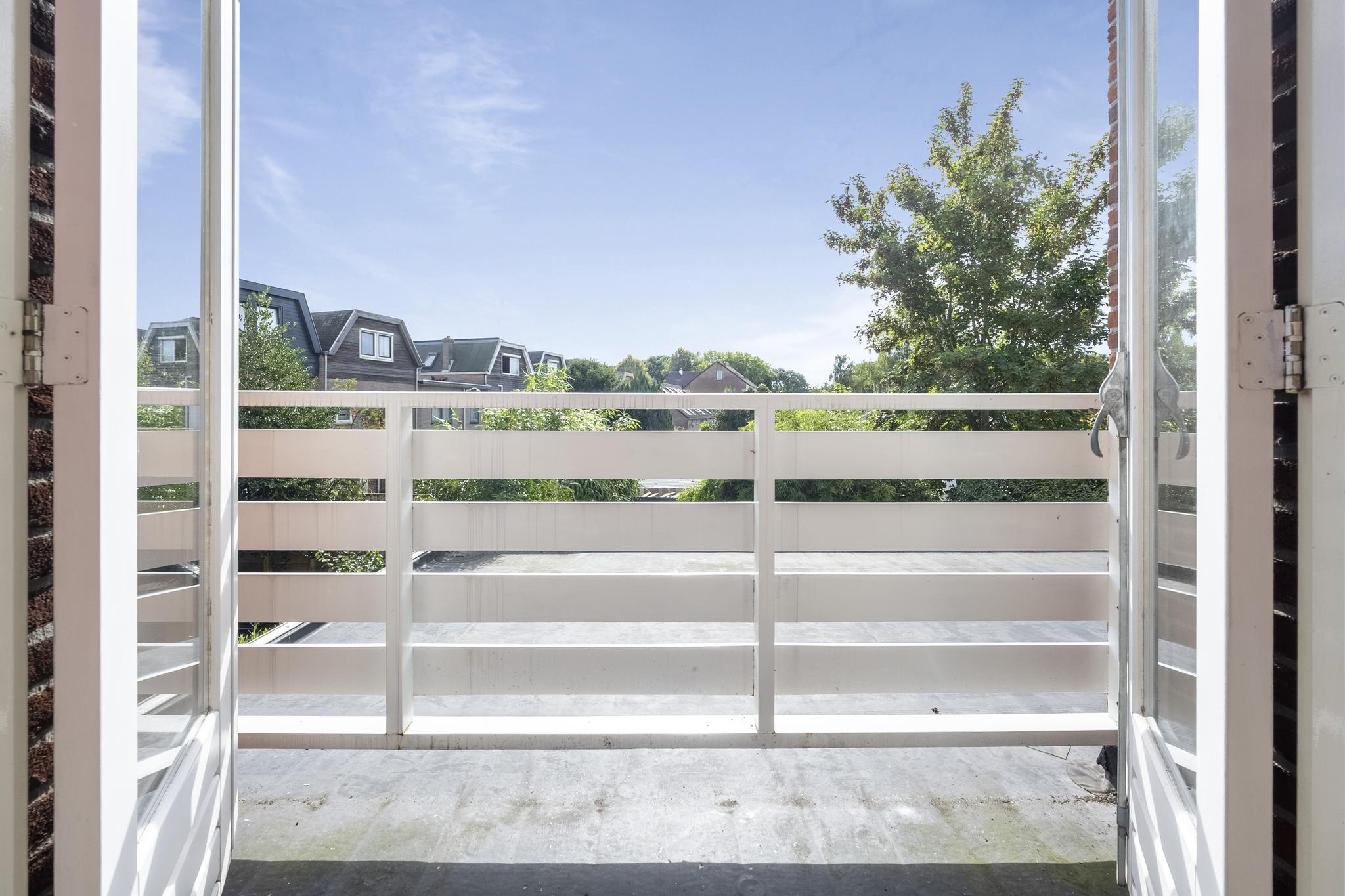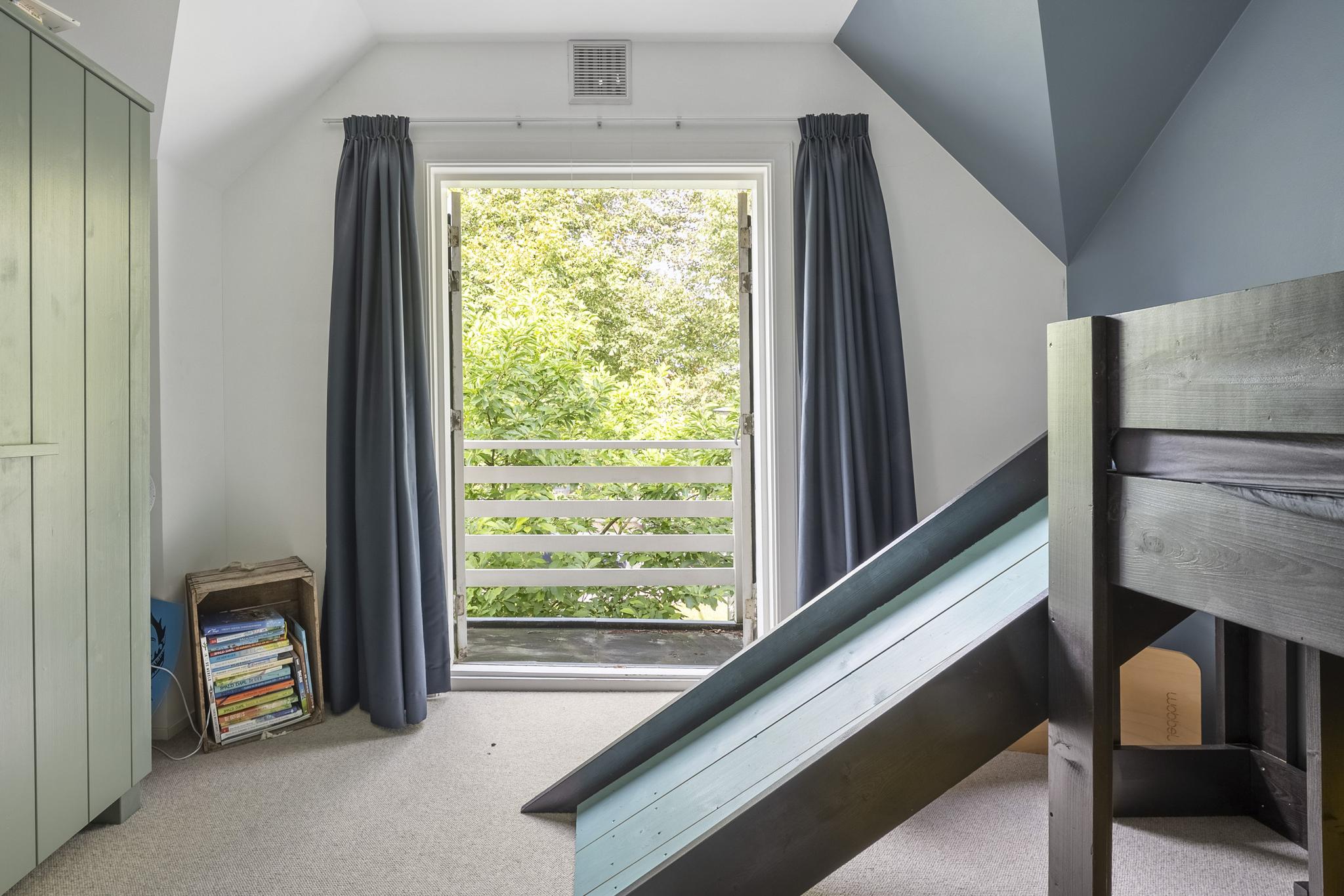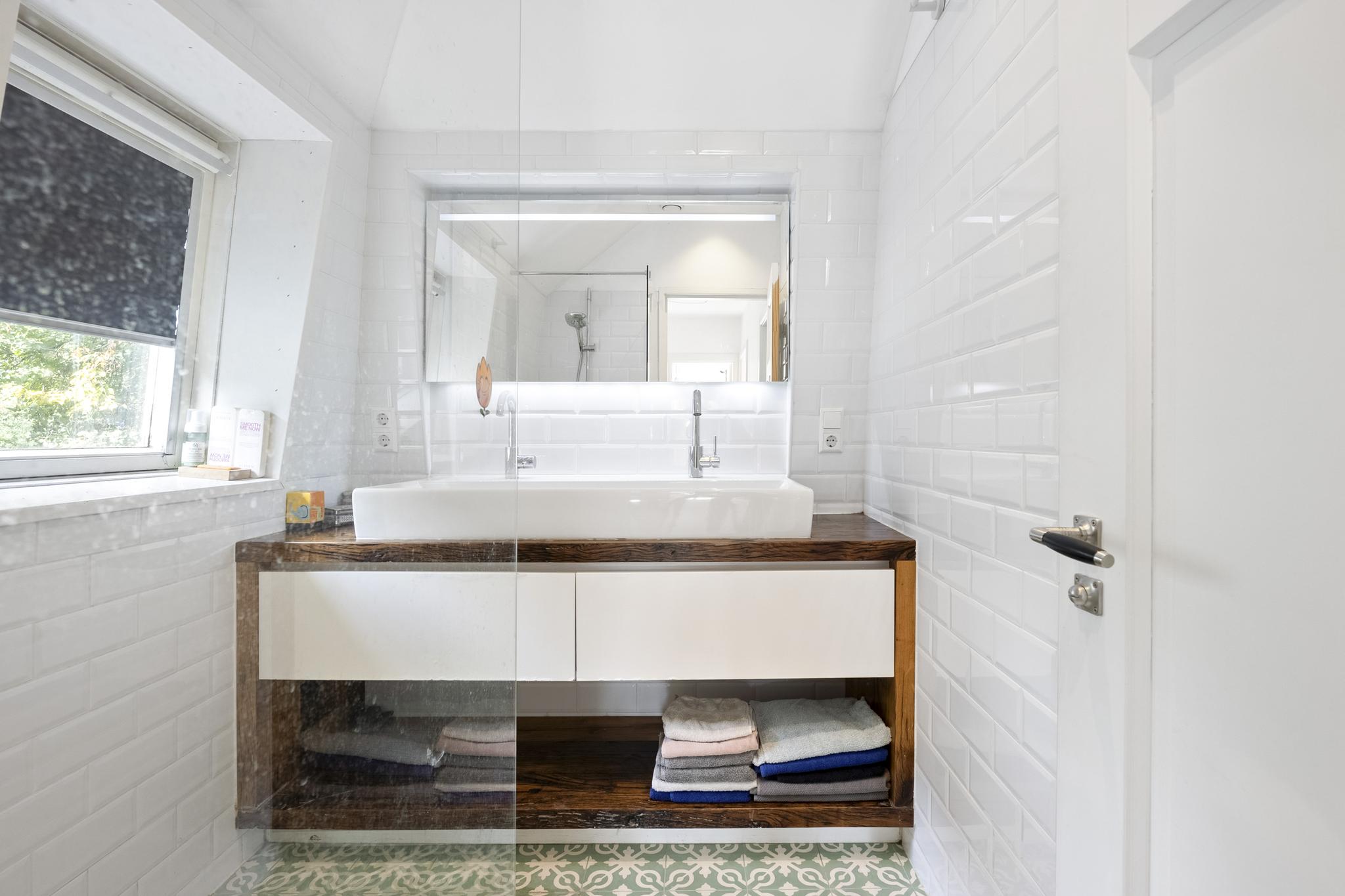 1e Verdieping: overloop, apart toilet, 3 slaapkamers, waarvan er 2 met openslaande deuren naar een balkon. De badkamer (2017) heeft een inloopdouche en een dubbele wastafel.