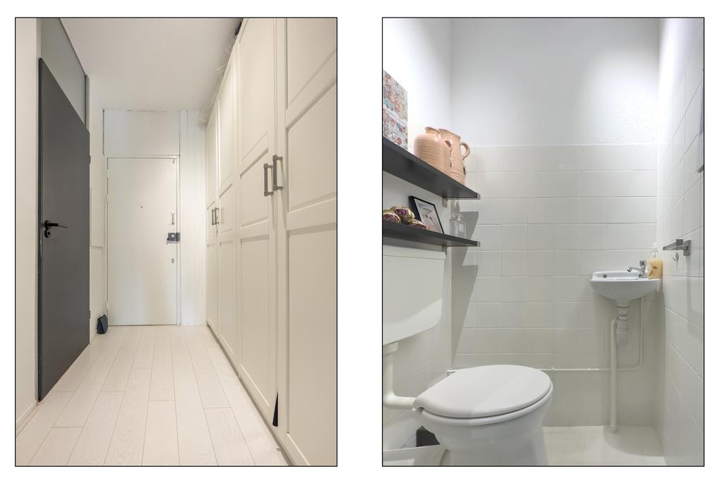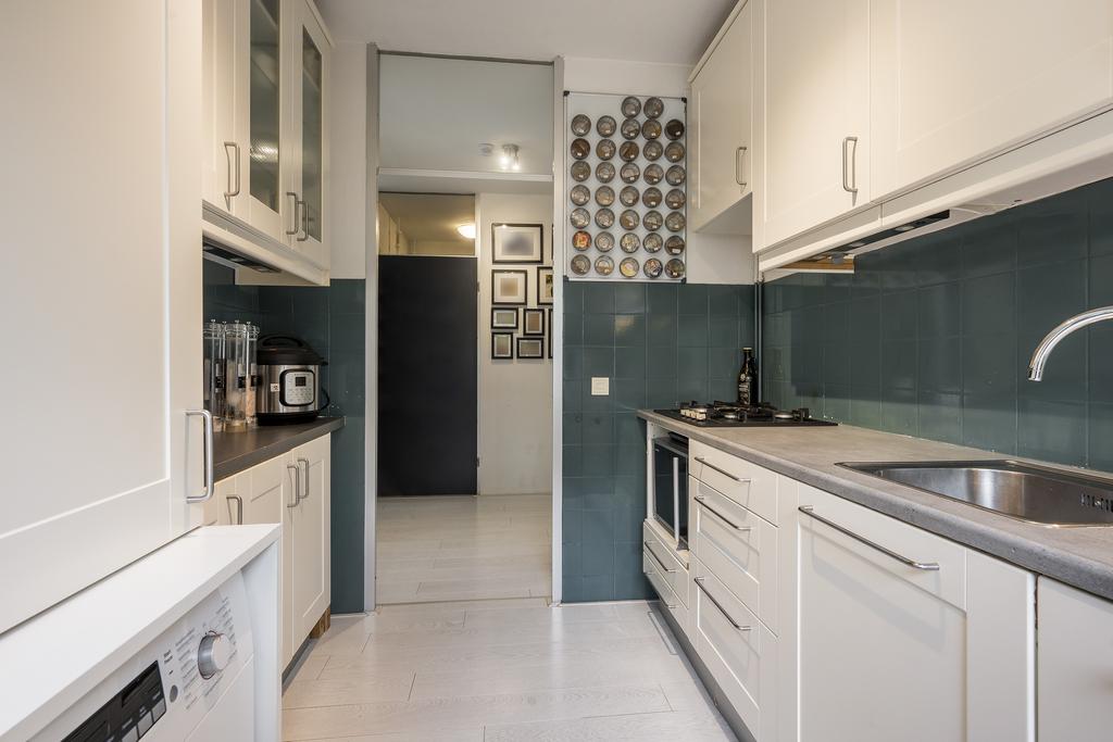 2e verdieping: entree, toilet met fontein, brede woonkamer, de dichte keuken is voorzien van inbouwapparatuur (de apparatuur is 2-3 jaar geleden vernieuwd), 1e slaapkamer met toegang tot balkon, eventueel samen te voegen bij de woonkamer. De grote tweede slaapkamer heeft een raam op het zuiden, badkamer met douche en wastafel en inpandige berging.