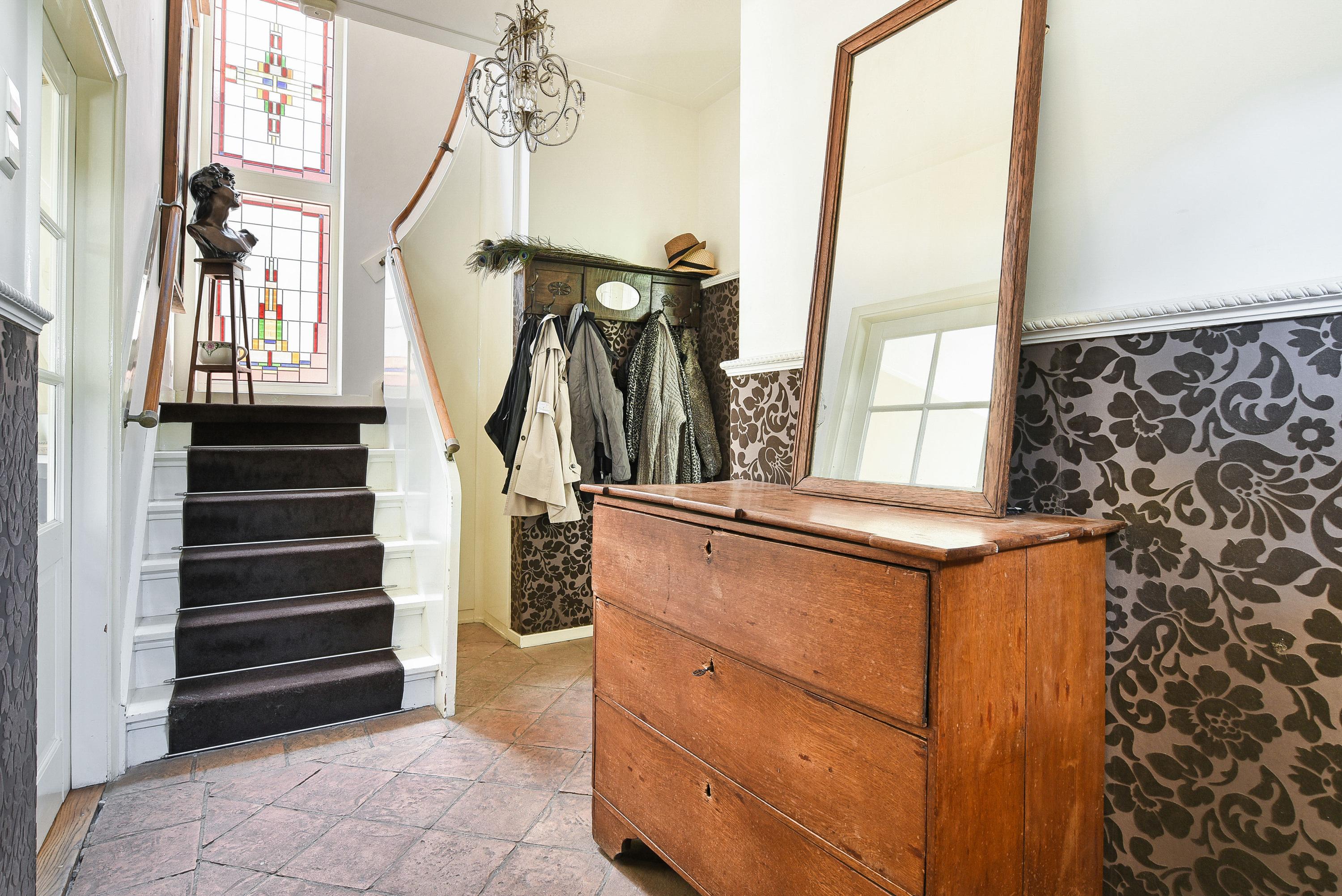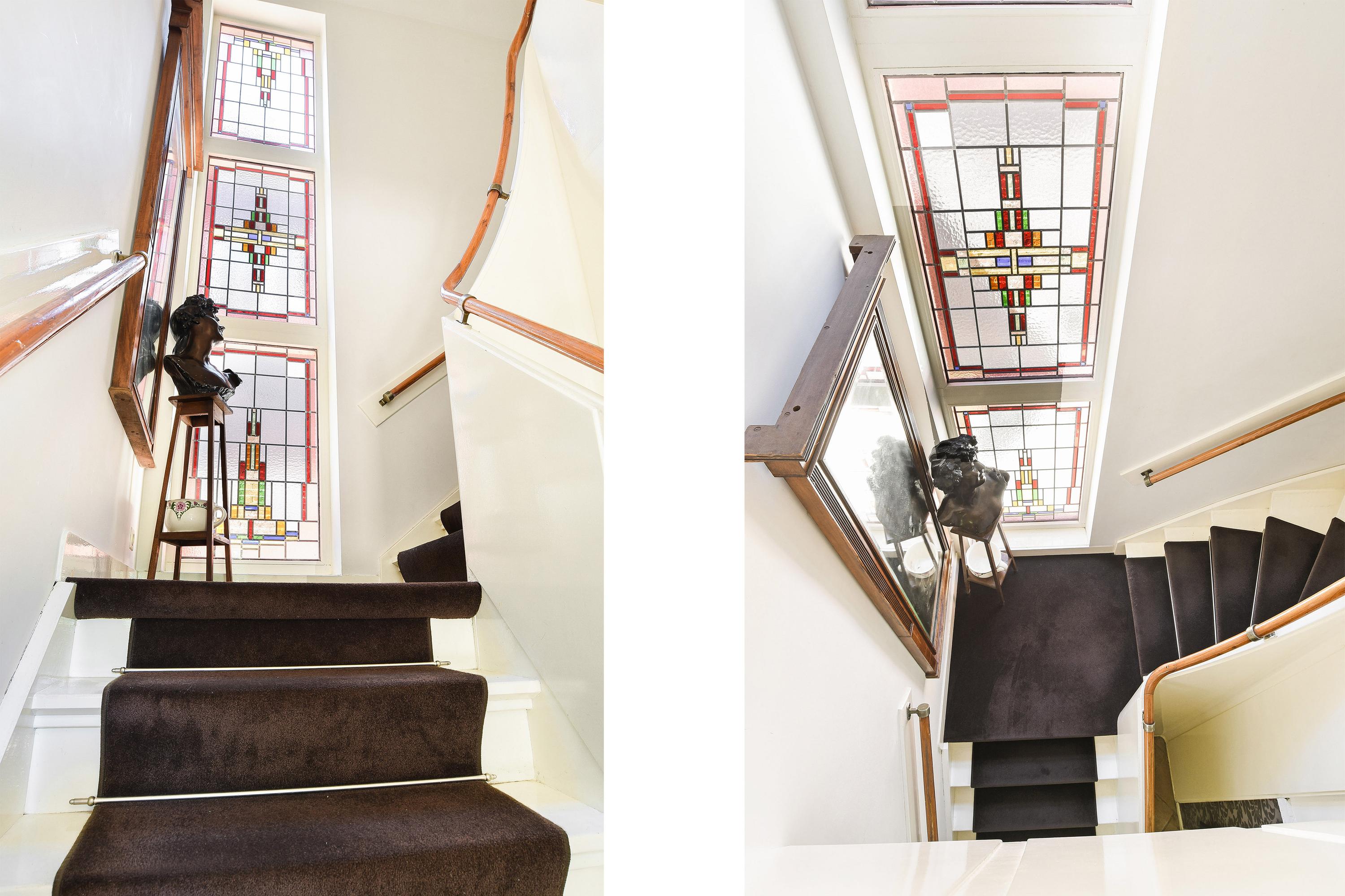 entree, hal met garderobe en ruim toilet met fontein, zeer lichte woonkamer voorzien van goede raampartijen, openslaande deuren naar tuin, schouw met geïntegreerde spiegel en open haard, sfeervolle landelijke woonkeuken met open haard en voorzien van 5-pits Smeg kookcomfort, 4 inbouwkasten waarvan 1 met wasmachine/droger aansluiting, deur naar achtertuin en halfronde openslaande deuren naar voortuin, via hal bordestrap met fraai glas-in-lood raampartij naar….