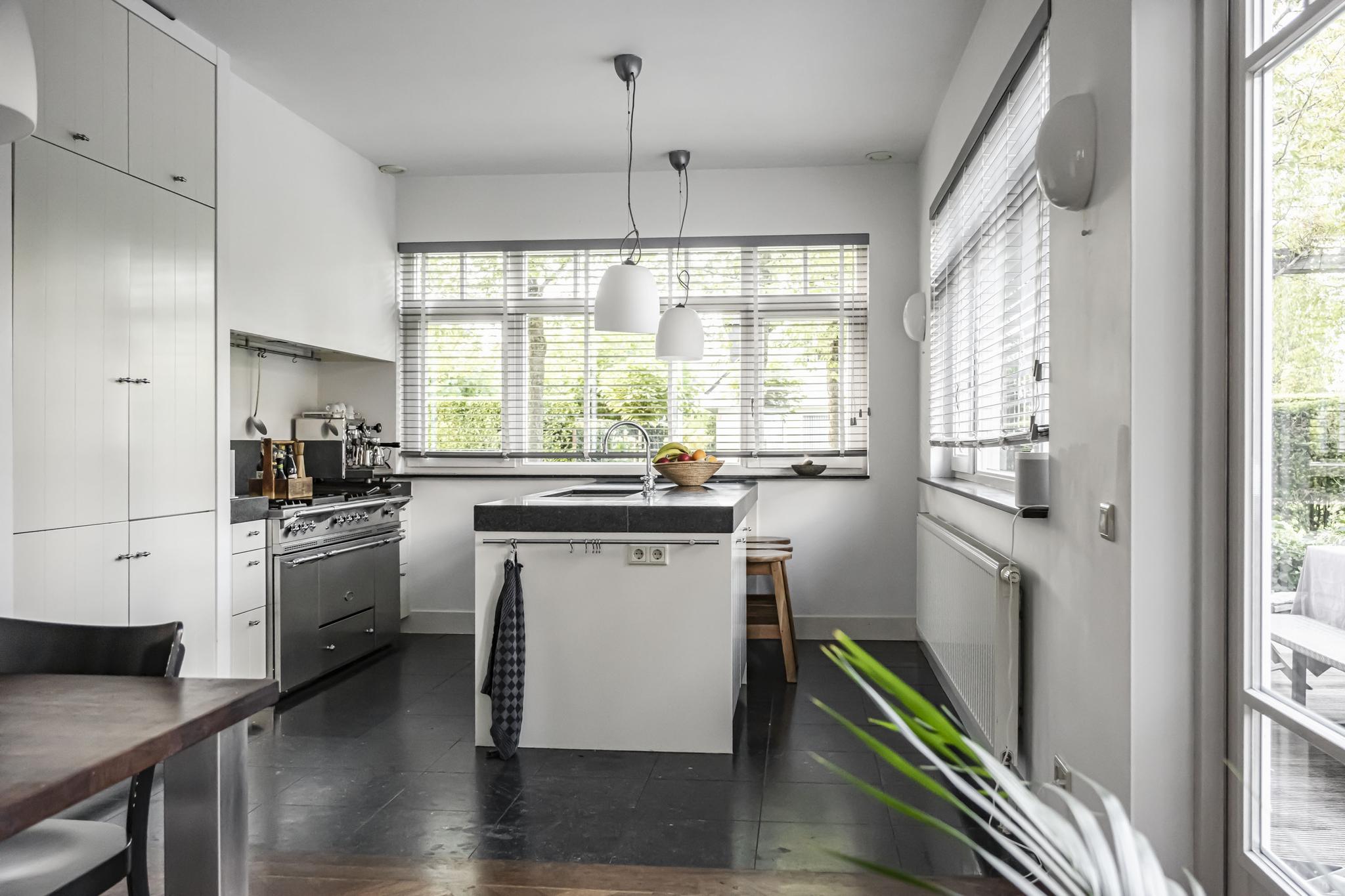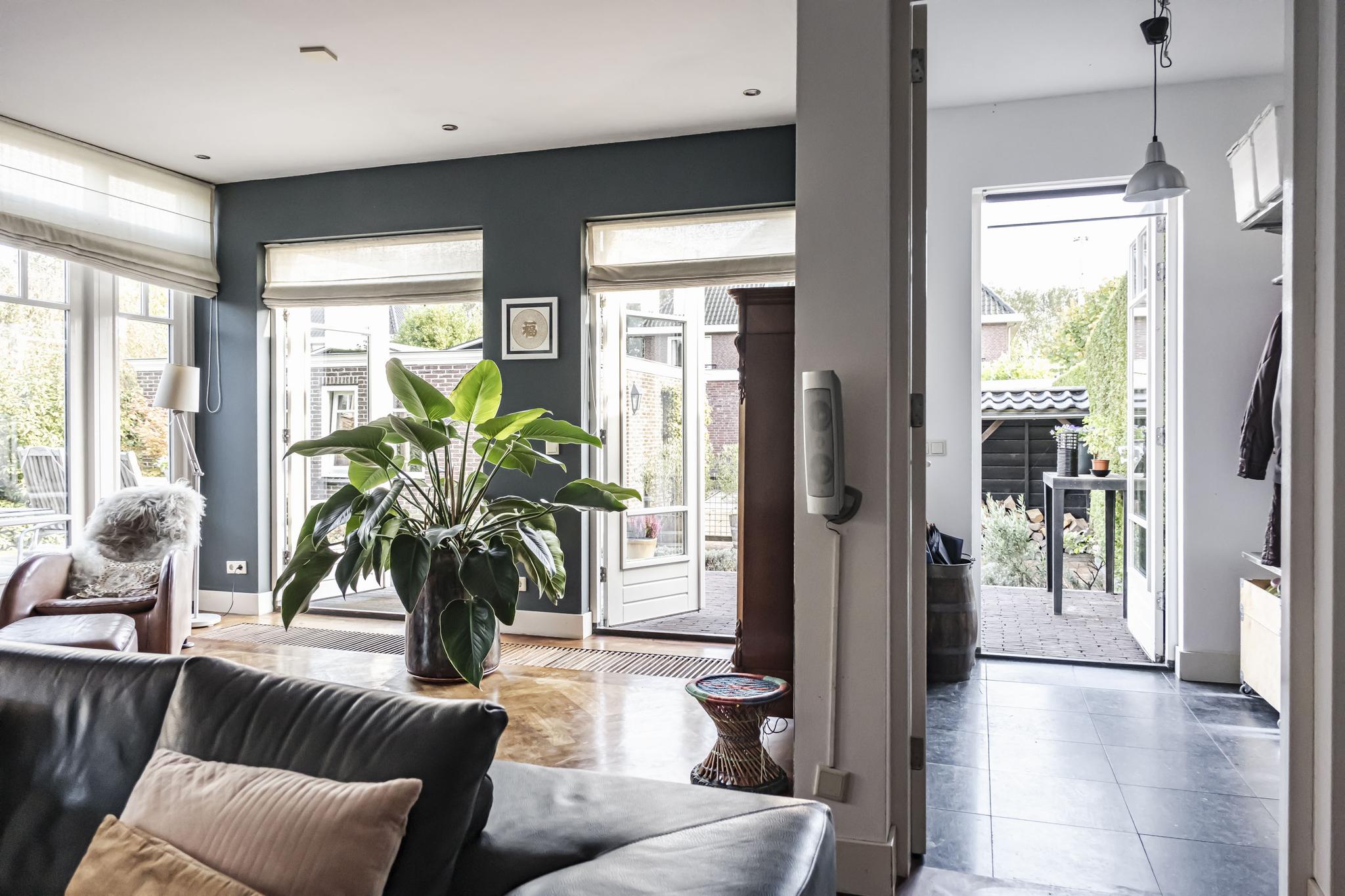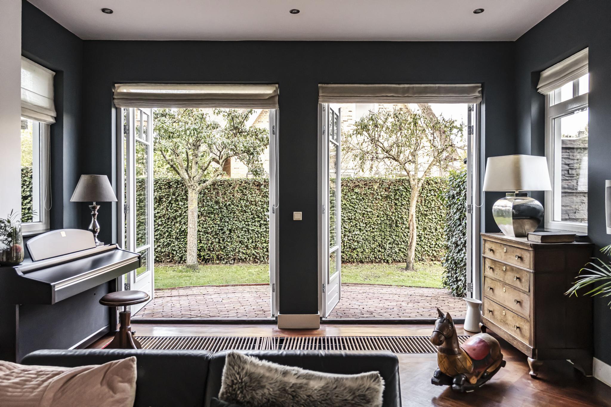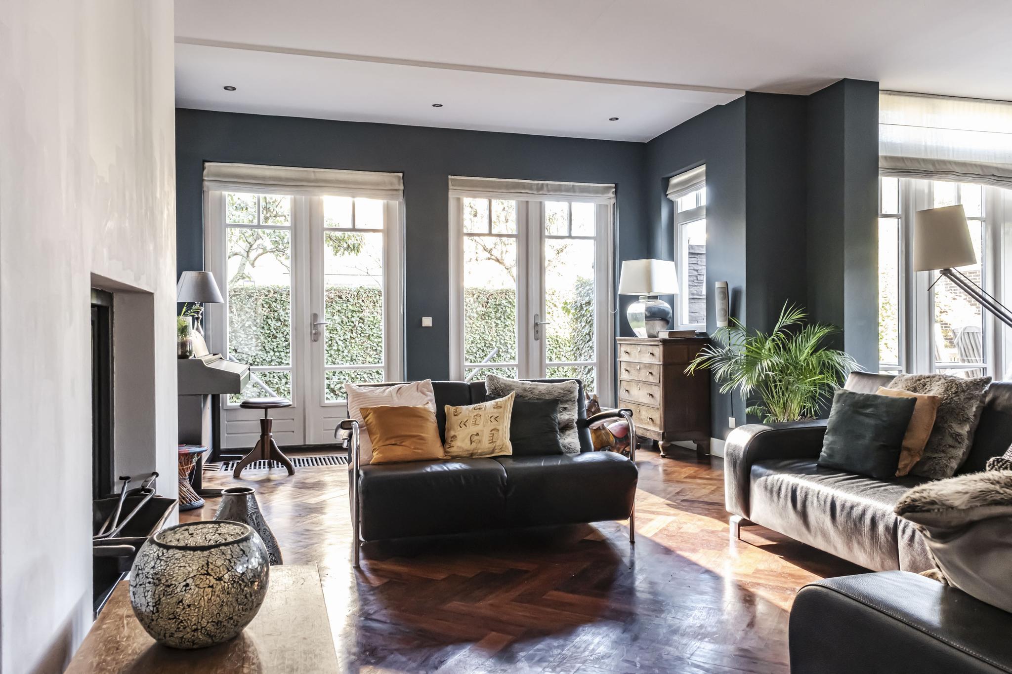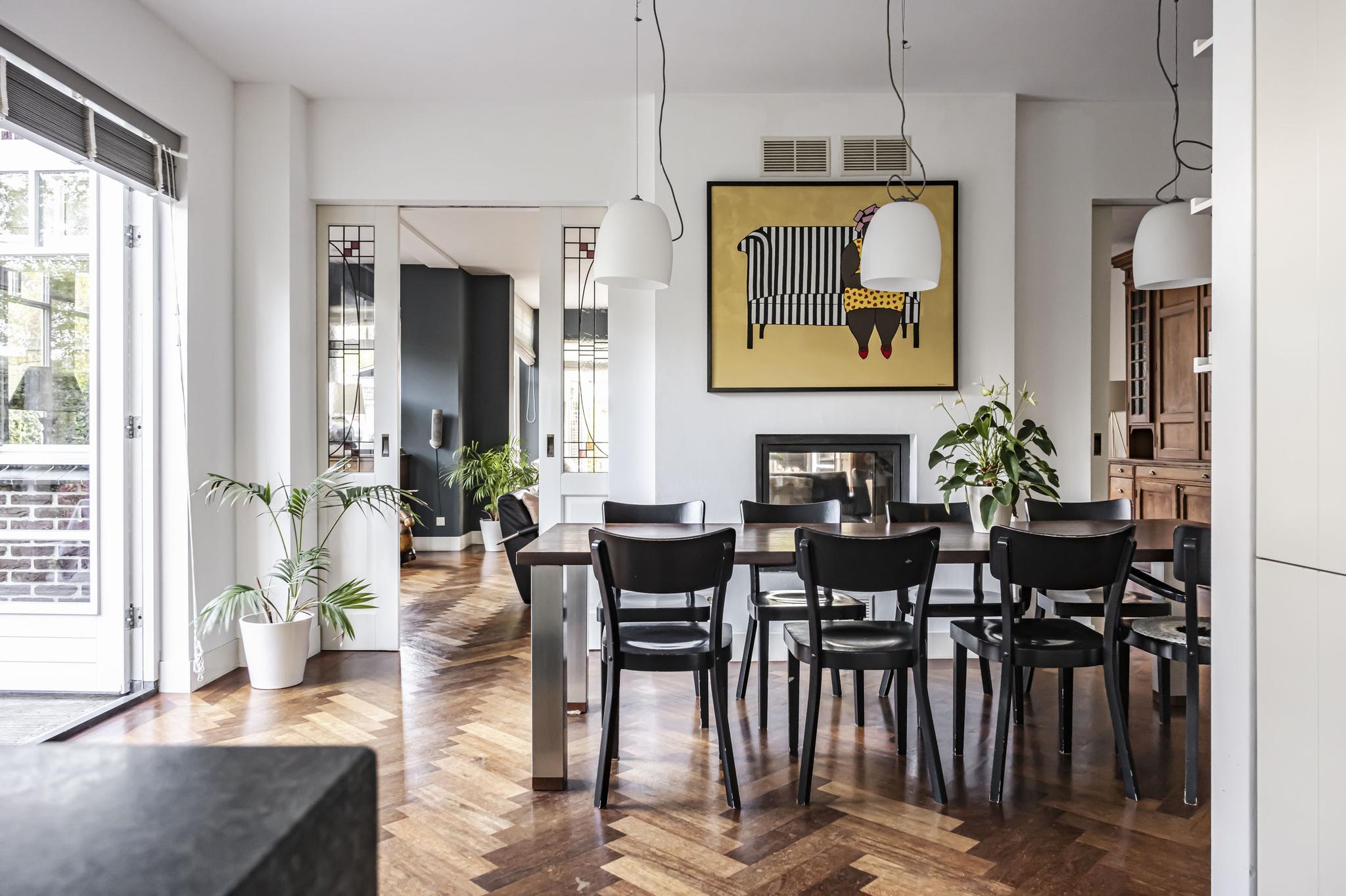 Begane grond: ruime hal met meterkast en garderobe, modern toilet met fontein. Ruime eetkamer met open keuken, ingebouwd bureau, een dichte doorkijk houthaard en openslaande deuren naar de tuin. De open keuken is voorzien van een natuurstenen werkblad, koelkast, vriezer, Lacanche 4-pits gasfornuis met grillplaat, coupe de feu, vaatwasser en oven. De eetkamer is door dubbele schuifdeuren gescheiden van de ruime zitkamer, die is voorzien van 4 openslaande deuren naar de tuin. Deze kant is ook voorzien van een haard. De achteringang beschikt over een garderoberuimte met een deur naar de tuin. De eet- en zitkamer zijn voorzien van visgraatparket met bies en hoge plafonds (2,80 m).