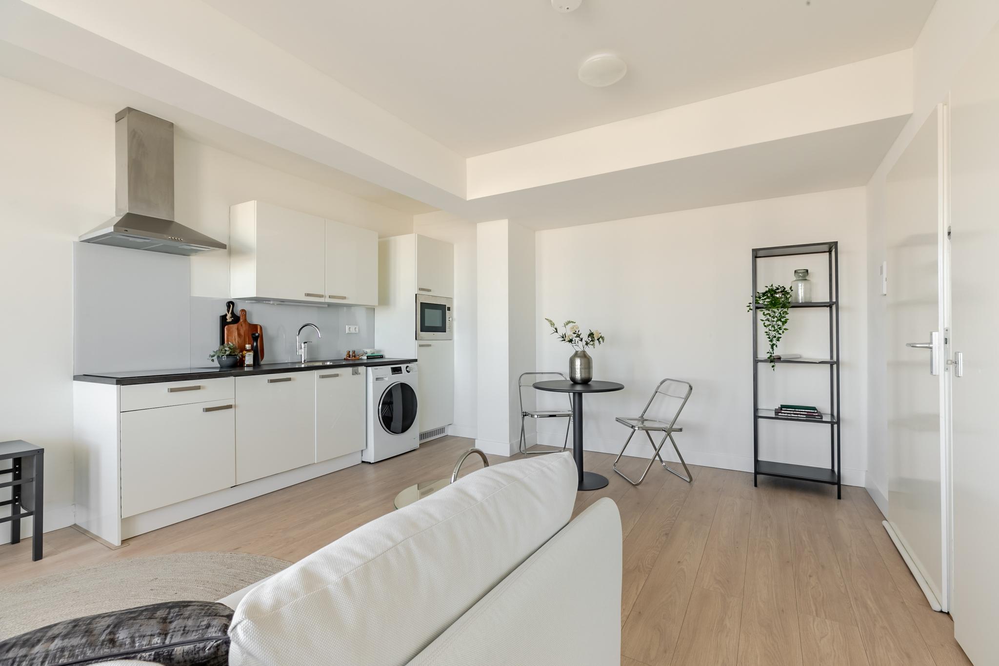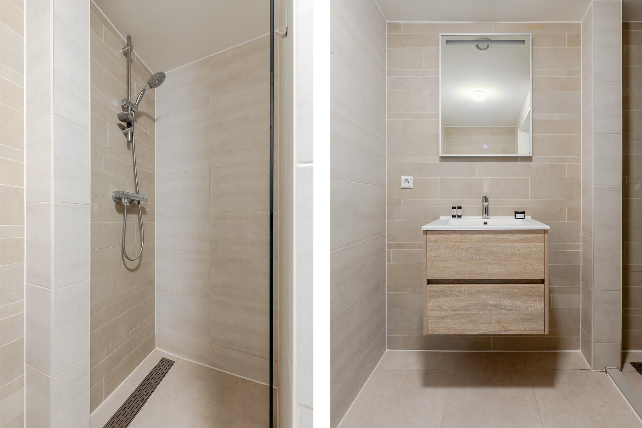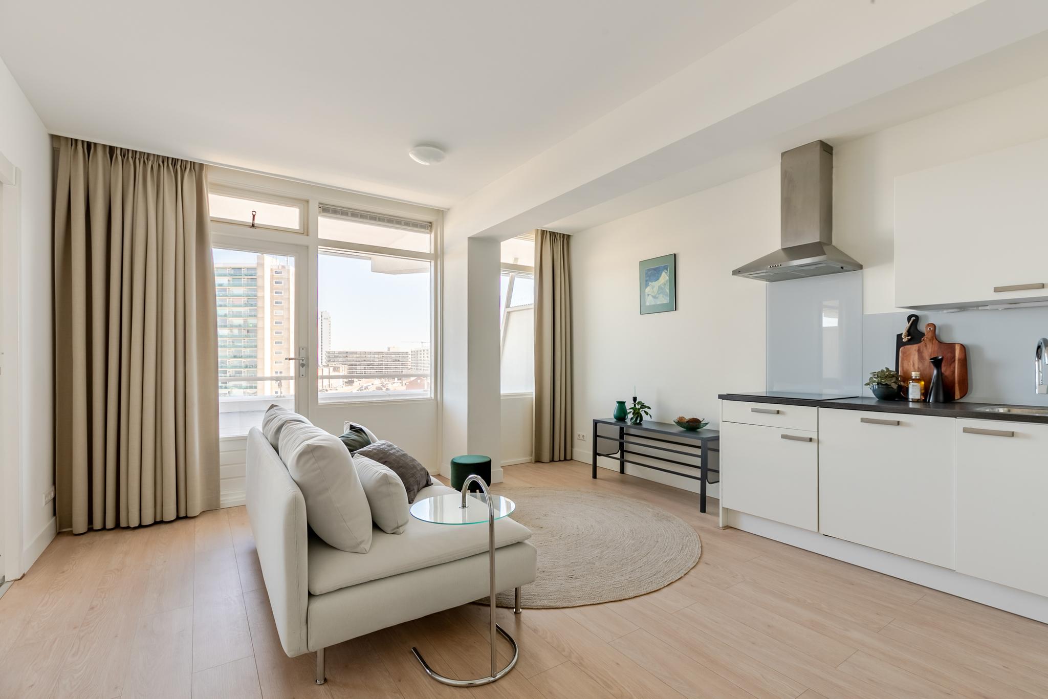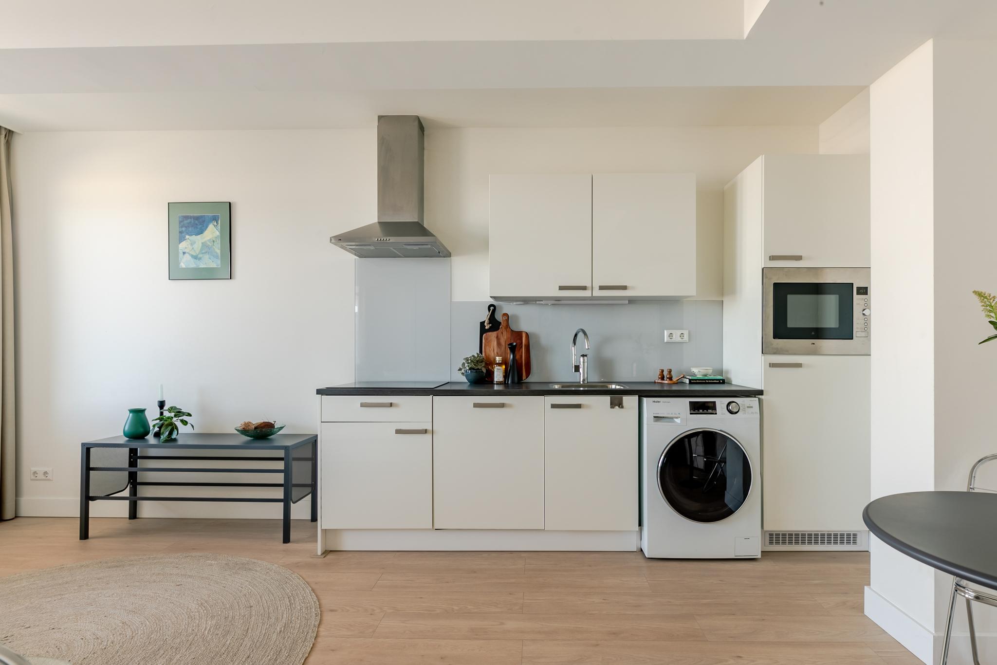 Binnenkomst in de hal met toegang tot de moderne badkamer, uitgerust met een stijlvolle wastafel met meubel, spiegel, inloopdouche en toilet. De woonkamer met open keuken is voorzien van alle benodigde inbouwapparatuur, waaronder een inductiekookplaat, afzuigkap, vaatwasser, wasmachine, koel-vriescombinatie en magnetron. Vanuit de woonkamer heb je toegang tot het eerste balkon met een bergkast. Vanuit de aangrenzende slaapkamer stap je zo het tweede balkon op, tevens met bergkast, waar je geniet van zeezicht en frisse lucht.